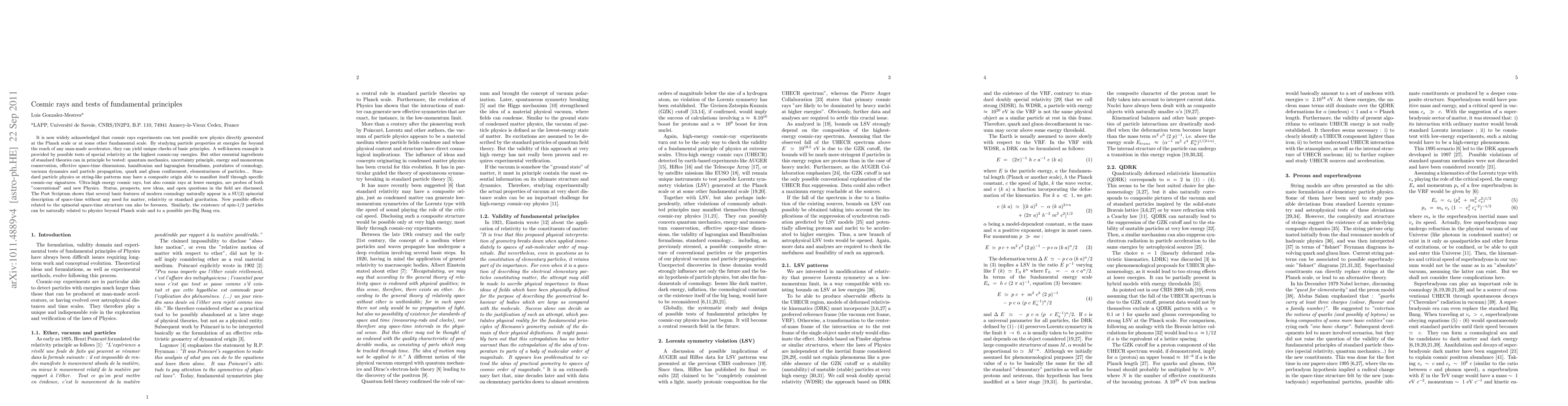 It is now widely acknowledged that cosmic rays experiments can test possible new physics directly generated at the Planck scale or at some other fundamental scale. By studying particle properties at energies far beyond the reach of any man-made accelerator, they can yield unique checks of basic principles. A well-known example is provided by possible tests of special relativity at the highest cosmic-ray energies. But other essential ingredients of standard theories can in principle be tested: quantum mechanics, uncertainty principle, energy and momentum conservation, effective space-time dimensions, hamiltonian and lagrangian formalisms, postulates of cosmology, vacuum dynamics and particle propagation, quark and gluon confinement, elementariness of particles... Standard particle physics or string-like patterns may have a composite origin able to manifest itself through specific cosmic-ray signatures. Ultra-high energy cosmic rays, but also cosmic rays at lower energies, are probes of both "conventional" and new Physics. Status, prospects, new ideas, and open questions in the field are discussed. The Post Scriptum shows that several basic features of modern cosmology naturally appear in a SU(2) spinorial description of space-time without any need for matter, relativity or standard gravitation. New possible effects related to the spinorial space-time structure can also be foreseen. Similarly, the existence of spin-1/2 particles can be naturally related to physics beyond Planck scale and to a possible pre-Big Bang era.