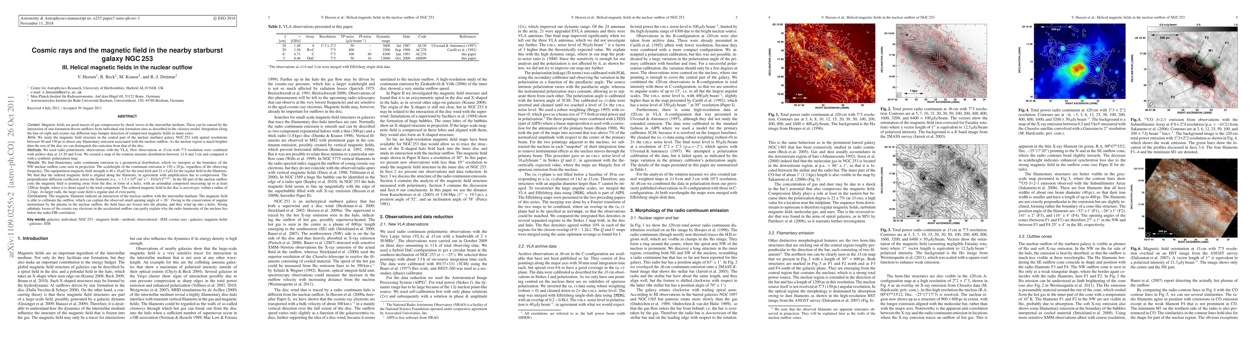 Magnetic fields are a good tracer for gas compression by shock waves, which can be caused by interaction of star-formation driven outflows from individual star formation sites as described in the chimney model. We study the magnetic field structure in the central part of the nuclear starburst galaxy NGC 253 with spatial resolutions between 40 and 150 pc to detect any filamentary emission associated with the nuclear outflow. New VLA observations at 3 cm with 7.5" resolution were combined with archive data at 20 and 6 cm. We find filamentary radio continuum emission in a geometrical distribution that we interpret as the boundary of the northwestern nuclear outflow cone. The scaleheight of the continuum emission is 150+/-20 pc, regardless of the observing frequency. The equipartition magnetic field strength is 46+/-10 microG for the total field and 21+/-5 microG for the regular field in the filaments. The ordered magnetic field is aligned along the filaments, in agreement with amplification due to compression. The perpendicular diffusion coefficient across the filaments is kappa_perp = 1.5 x 10^28 cm^2 s^-1 E(GeV)^(0.5+/-0.7). In the SE part of the nuclear outflow cone the magnetic field is pointing away from the disc in form of a helix, with an azimuthal component increasing up to at least 1200 pc height, where it is about equal to the total component. The ordered magnetic field in the disc is anisotropic within a radius of 2.2 kpc. At larger radii, the large-scale field is regular and of even parity. The magnetic field is able to collimate the outflow, which can explain the observed small opening angle of ~26 degree. Due to angular momentum conservation, the field lines are frozen into the plasma and are wound up into a helix. Strong adiabatic losses of the cosmic-ray electrons can partly explain why the radio luminosity of the nucleus lies below the radio-FIR correlation.