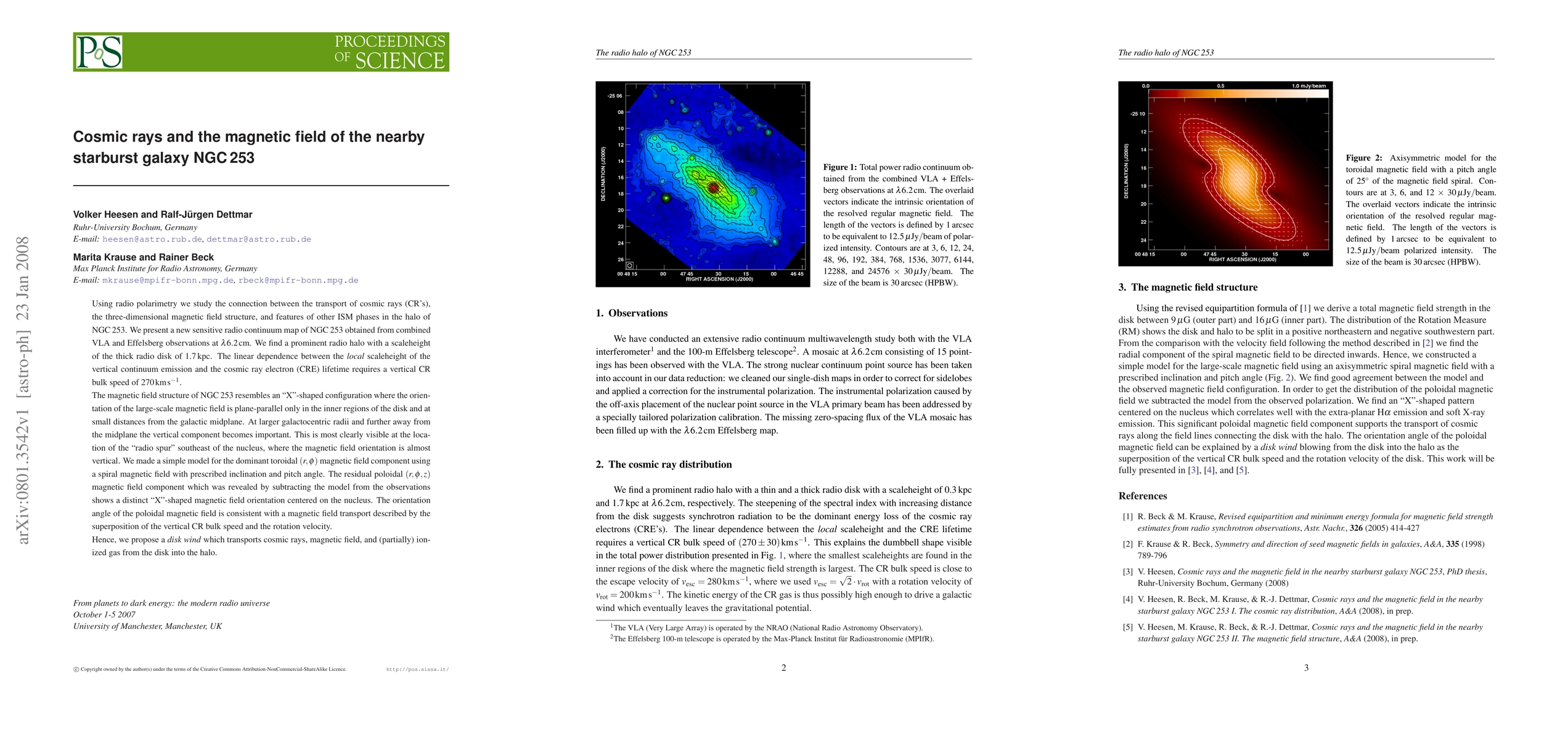 The study uses radio polarimetry to examine cosmic ray transport and magnetic field structure in the starburst galaxy NGC 253. Findings include a thick radio disk with a scaleheight of 1.7 kpc, a vertical cosmic ray bulk speed of 270 km/s, and an 'X'-shaped magnetic field configuration. The research proposes a disk wind transporting cosmic rays, magnetic fields, and gas from the disk into the halo.