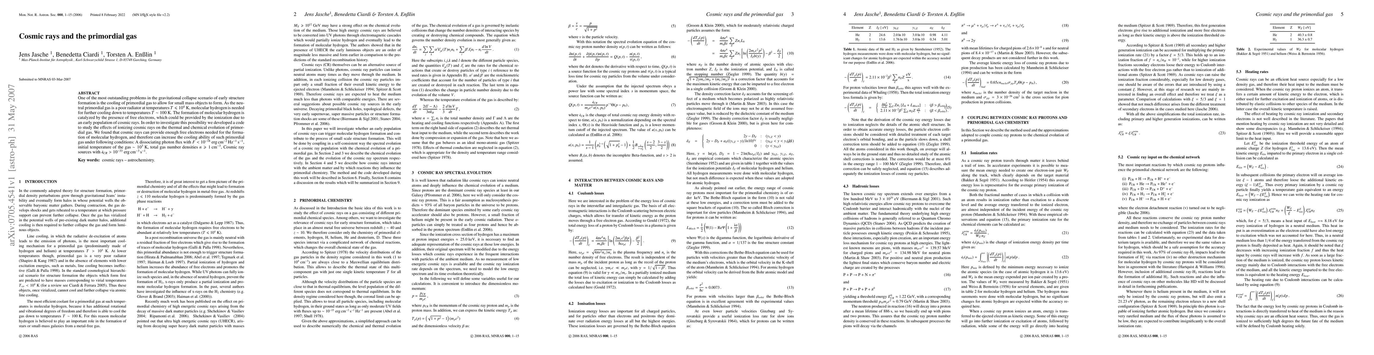 One of the most outstanding problems in the gravitational collapse scenario of early structure formation is the cooling of primordial gas to allow for small mass objects to form. As the neutral primordial gas is a poor radiator at temperatures (T\le10^4\unit{K}), molecular hydrogen is needed for further cooling down to temperatures (T\sim100\unit{K}). The formation of molecular hydrogen is catalyzed by the presence of free electrons, which could be provided by the ionization due to an early population of cosmic rays. In order to investigate this possibility we developed a code to study the effects of ionizing cosmic rays on the thermal and chemical evolution of primordial gas. We found that cosmic rays can provide enough free electrons needed for the formation of molecular hydrogen, and therefore can increase the cooling ability of such primordial gas under following conditions: A dissociating photon flux with (F<10^{-18}\unit{erg cm^{-2} Hz^{-1} s^{-1}}), initial temperature of the gas (\sim10^{3}\unit{K}), total gas number densities (n\ge1\unit{cm^{-3}}), Cosmic ray sources with (\dot{\epsilon}_{CR}>10^{-33}\unit{erg cm^{-3} s^{-1}}).
