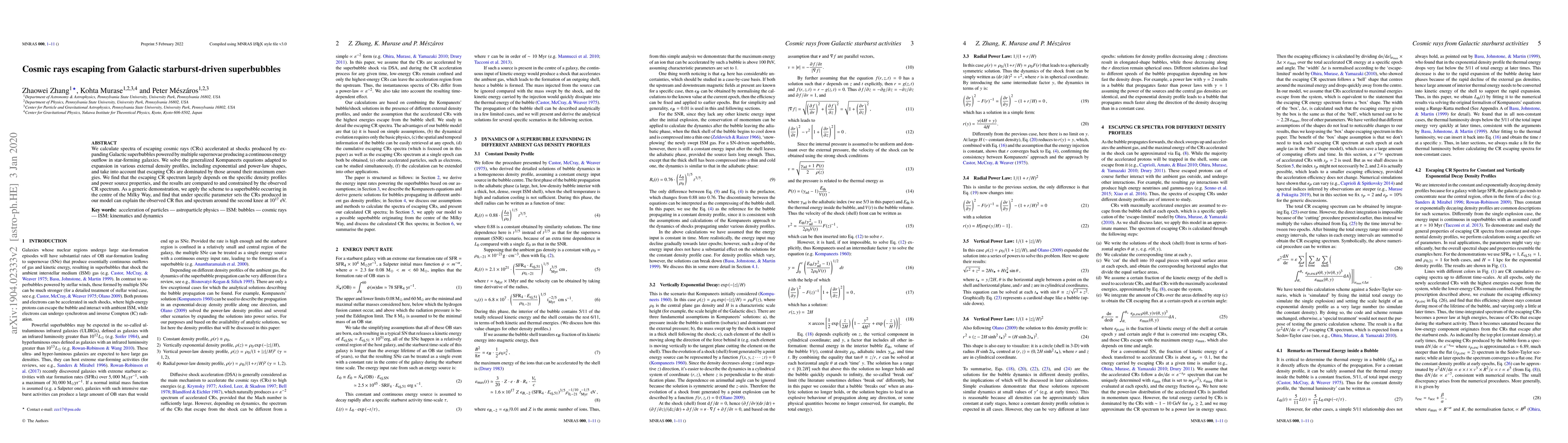 This paper calculates the spectra of cosmic rays escaping from Galactic starburst-driven superbubbles, finding that the escaping cosmic ray spectrum is heavily influenced by the density profiles and properties of the power source. The study demonstrates that the model can explain the observed cosmic ray flux and spectrum around the second knee at $10^{17}$ eV under specific conditions.
