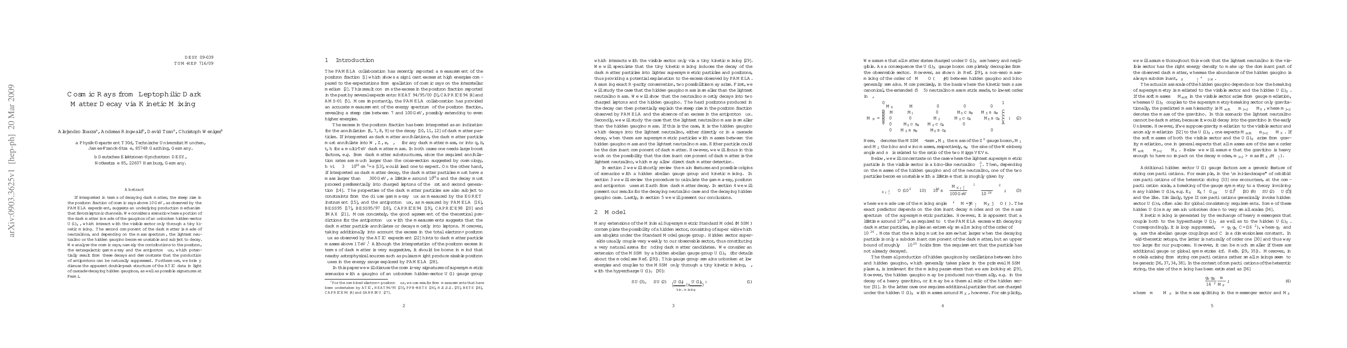 This paper explores a leptophilic dark matter decay scenario via kinetic mixing, where dark matter consists of gauginos and neutralinos. It examines the resulting cosmic rays, including positrons, gamma rays, and antiprotons, and suggests that this model could explain the PAMELA positron fraction anomaly and the ATIC double-peak structure.