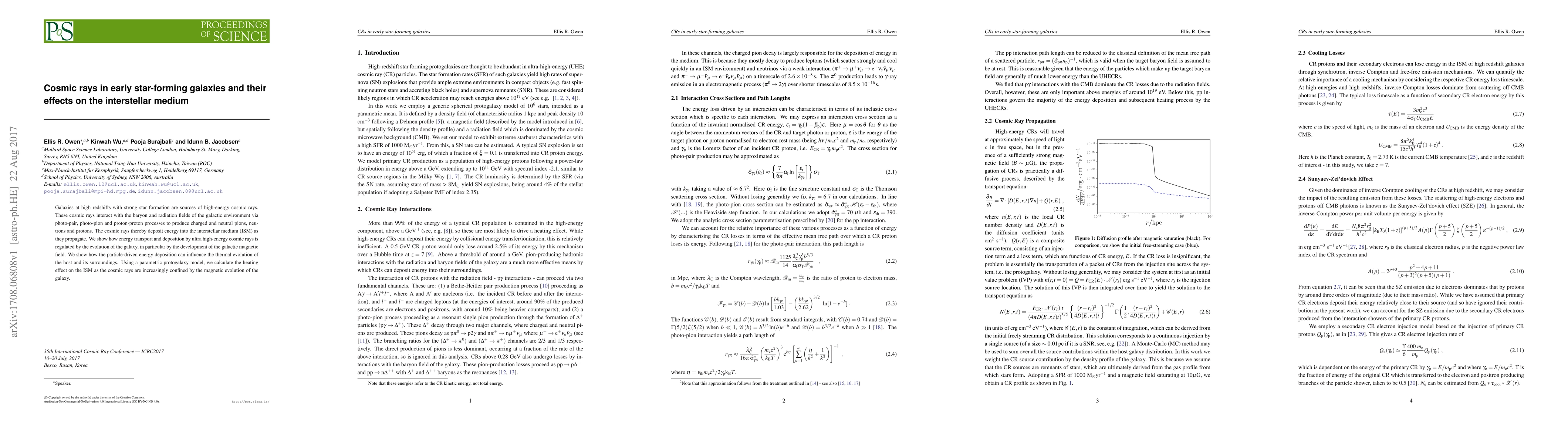 Galaxies at high redshifts with strong star formation are sources of high-energy cosmic rays. These cosmic rays interact with the baryon and radiation fields of the galactic environment via photo-pair, photo-pion and proton-proton processes to produce charged and neutral pions, neutrons and protons. The cosmic rays thereby deposit energy into the interstellar medium (ISM) as they propagate. We show how energy transport and deposition by ultra high-energy cosmic rays is regulated by the evolution of the galaxy, in particular by the development of the galactic magnetic field. We show how the particle-driven energy deposition can influence the thermal evolution of the host and its surroundings. Using a parametric protogalaxy model, we calculate the heating effect on the ISM as the cosmic rays are increasingly confined by the magnetic evolution of the galaxy.