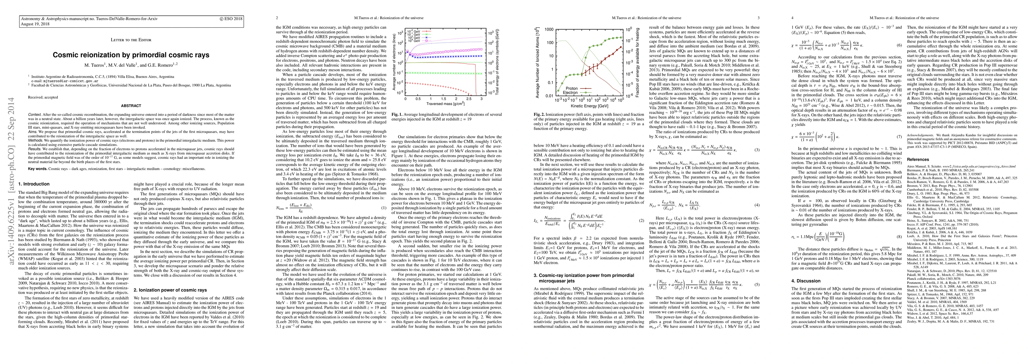 This paper proposes that primordial cosmic rays, accelerated by the jets of early microquasars, may have significantly contributed to cosmic reionization. The authors use particle cascade simulations to quantify the ionization power of these cosmic rays and suggest they could have played a role comparable to X-rays from microquasar accretion disks.