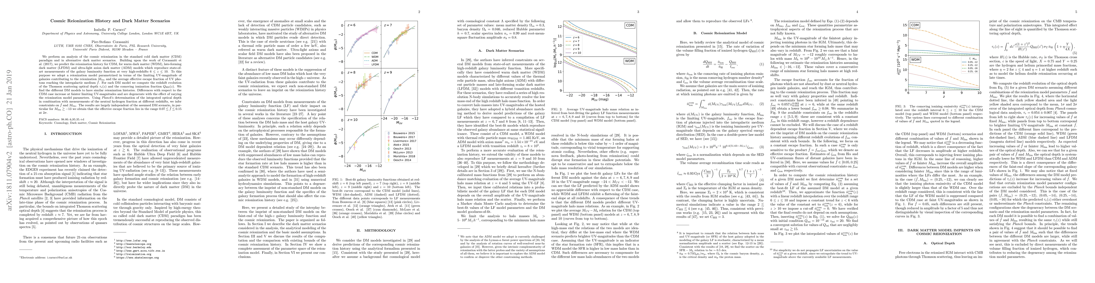 This study compares the cosmic reionization process in standard Cold Dark Matter (CDM) and alternative dark matter scenarios like Warm Dark Matter (WDM), Late-forming Dark Matter (LFDM), and ultra-light axion dark matter (ADM). The research predicts similar reionization histories across these models, with differences becoming more pronounced at fainter limiting UV-magnitudes. Using data from Planck's optical depth and neutral hydrogen fraction measurements, the study infers constraints on the effective escape fraction of UV photons, finding it to be around 0.07-0.15 at 2σ confidence for limiting UV-magnitudes brighter than -13, irrespective of the dark matter model assumed.