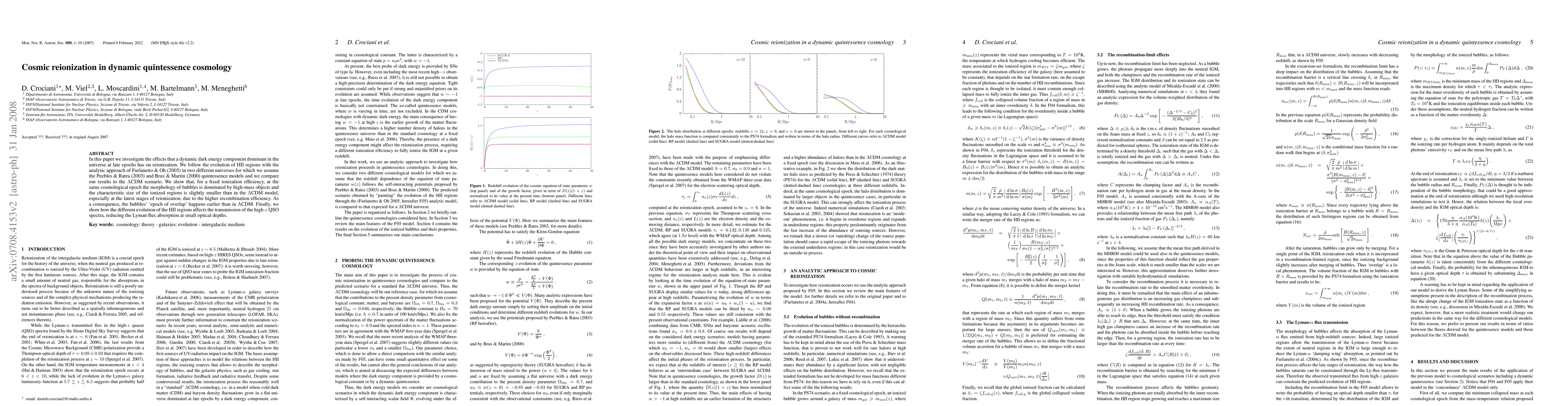 In this paper we investigate the effects that a dynamic dark energy component dominant in the universe at late epochs has on reionization. We follow the evolution of HII regions with the analytic approach of Furlanetto and Oh (2005) in two different universes for which we assume the Peebles and Ratra (2003) and Brax and Martin (2000) quintessence models and we compare our results to the LCDM scenario. We show that, for a fixed ionization efficiency, at the same cosmological epoch the topology of bubbles is dominated by high-mass objects and the characteristic size of the ionized regions is slightly smaller than in the LCDM model, especially at the latest stages of reionization, due to the higher recombination efficiency. As a consequence, the bubbles' `epoch of overlap' happens earlier than in LCDM. Finally, we show how the different evolution of the HII regions affects the transmission of the high-z QSO spectra, reducing the Lyman flux absorption at small optical depths.