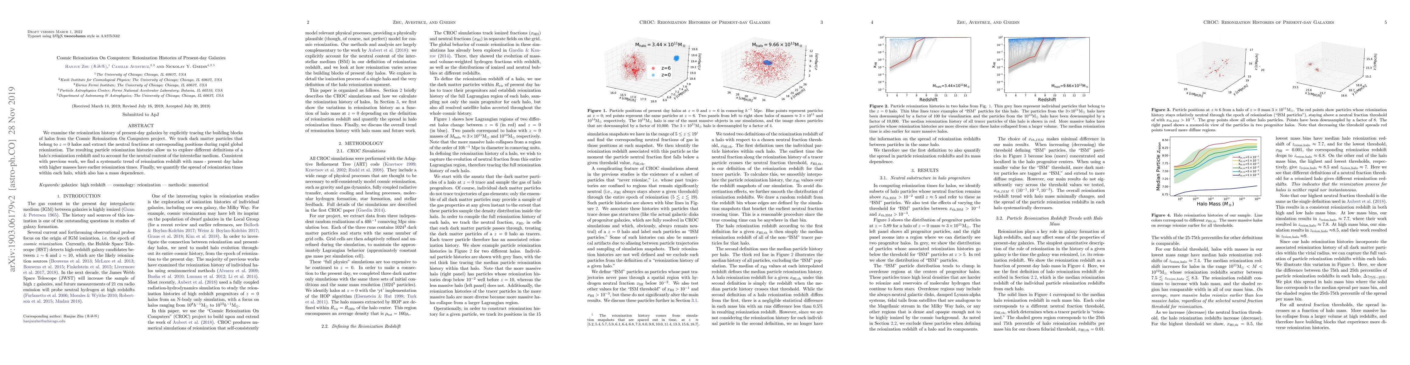 This paper investigates the reionization history of present-day galaxies using data from the Cosmic Reionization On Computers project, tracing dark matter particles to determine neutral fractions during reionization. It finds a systematic trend of earlier reionization times in more massive halos and quantifies the spread of reionization times within each halo, which also depends on mass.