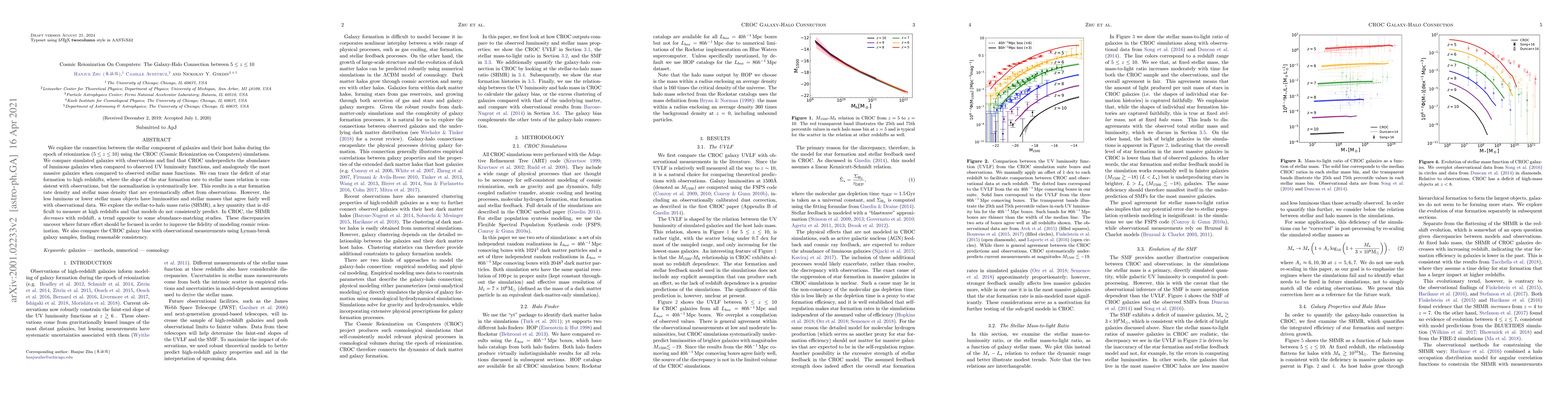 We explore the connection between the stellar component of galaxies and their host halos during the epoch of reionization ($5 \leq z\leq10$) using the CROC (Cosmic Reionization on Computers) simulations. We compare simulated galaxies with observations and find that CROC underpredicts the abundance of luminous galaxies when compared to observed UV luminosity functions, and analogously the most massive galaxies when compared to observed stellar mass functions. We can trace the deficit of star formation to high redshifts, where the slope of the star formation rate to stellar mass relation is consistent with observations, but the normalization is systematically low. This results in a star formation rate density and stellar mass density that is systematically offset from observations. However, the less luminous or lower stellar mass objects have luminosities and stellar masses that agree fairly well with observational data. We explore the stellar-to-halo mass ratio, a key quantity that is difficult to measure at high redshifts and that models do not consistently predict. In CROC, the stellar-to-halo mass ratio {\it decreases} with redshift, a trend opposite to some abundance matching studies. These discrepancies uncover where future effort should be focused in order to improve the fidelity of modeling cosmic reionization. We also compare the CROC galaxy bias with observational measurements using Lyman-Break Galaxy (LBG) samples. The good agreement of simulation and data shows that the clustering of dark matter halos is properly captured in CROC.