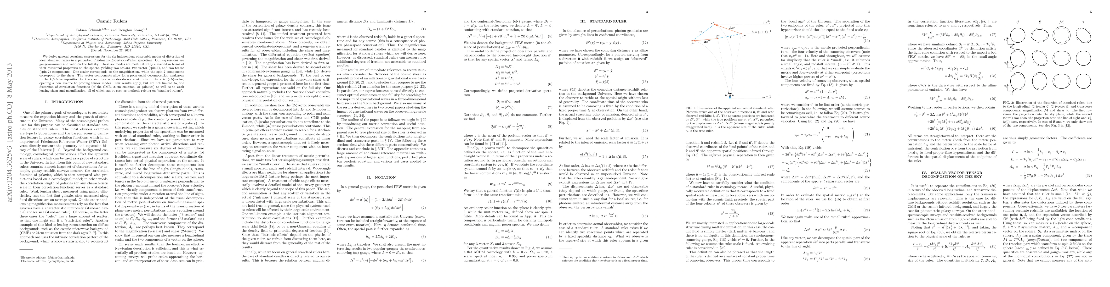 We derive general covariant expressions for the six independent observable modes of distortion of ideal standard rulers in a perturbed Friedmann-Robertson-Walker spacetime. Our expressions are gauge-invariant and valid on the full sky. These six modes are most naturally classified in terms of their rotational properties on the sphere, yielding two scalars, two vector (spin-1), and two tensor (spin-2) components. One scalar corresponds to the magnification, while the spin-2 components correspond to the shear. The vector components allow for a polar/axial decomposition analogous to the E/B-decomposition for the shear. Scalar modes do not contribute to the axial (B-)vector, opening a new avenue to probing tensor modes. Our results apply, but are not limited to, the distortion of correlation functions (of the CMB, 21cm emission, or galaxies) as well as to weak lensing shear and magnification, all of which can be seen as methods relying on "standard rulers".