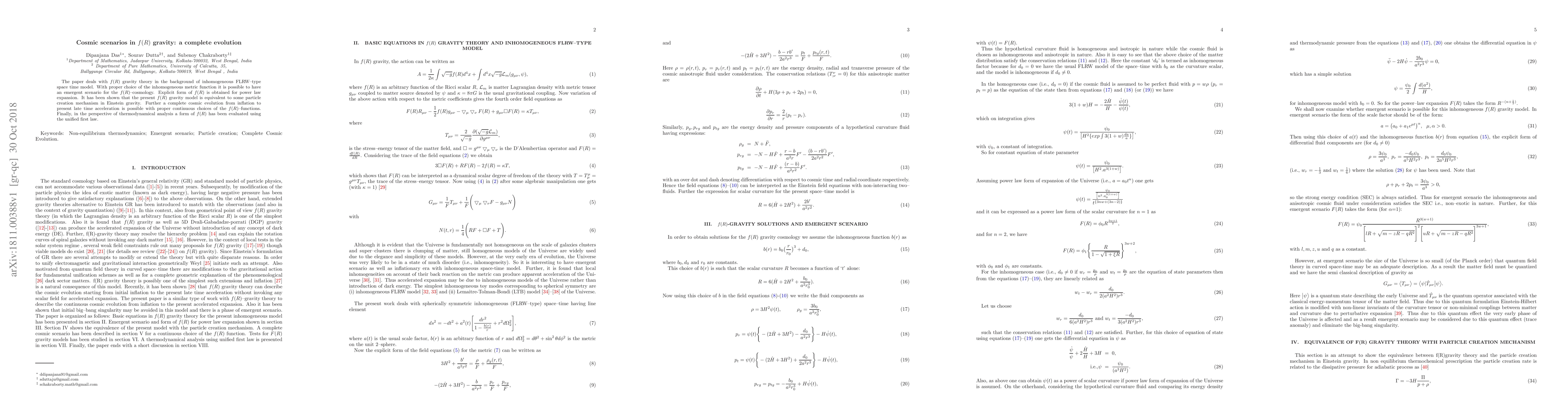 This paper explores $f(R)$ gravity within an inhomogeneous FLRW-type spacetime, demonstrating a complete cosmic evolution from inflation to late-time acceleration through specific $f(R)$-functions. It also shows equivalence to particle creation mechanisms in Einstein gravity and evaluates $f(R)$ using the unified first law in thermodynamical analysis.