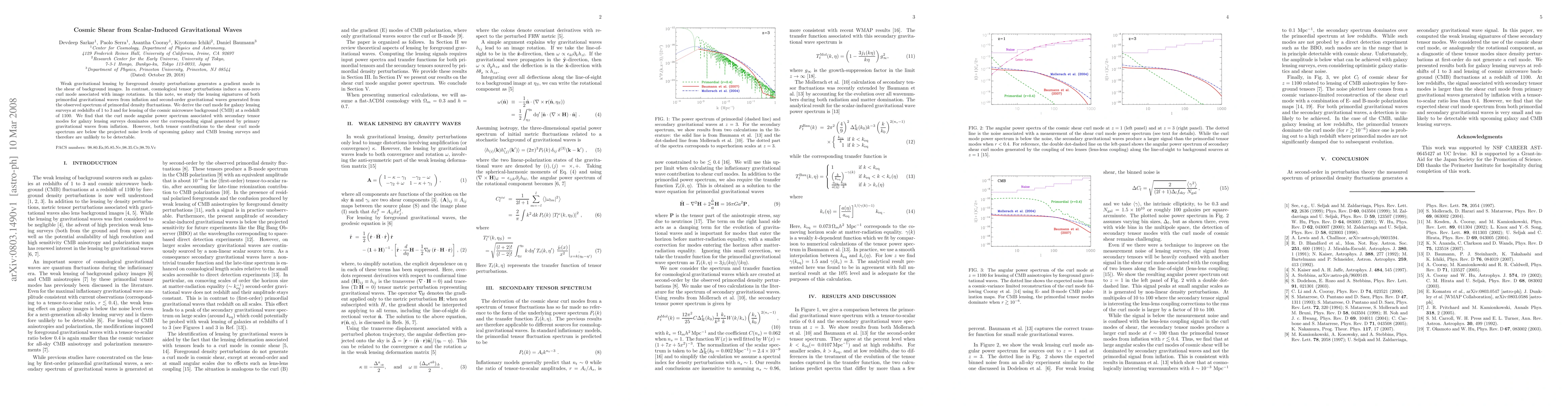 Weak gravitational lensing by foreground density perturbations generates a gradient mode in the shear of background images. In contrast, cosmological tensor perturbations induce a non-zero curl mode associated with image rotations. In this note, we study the lensing signatures of both primordial gravitational waves from inflation and second-order gravitational waves generated from the observed spectrum of primordial density fluctuations. We derive the curl mode for galaxy lensing surveys at redshifts of 1 to 3 and for lensing of the cosmic microwave background (CMB) at a redshift of 1100. We find that the curl mode angular power spectrum associated with secondary tensor modes for galaxy lensing surveys dominates over the corresponding signal generated by primary gravitational waves from inflation. However, both tensor contributions to the shear curl mode spectrum are below the projected noise levels of upcoming galaxy and CMB lensing surveys and therefore are unlikely to be detectable.