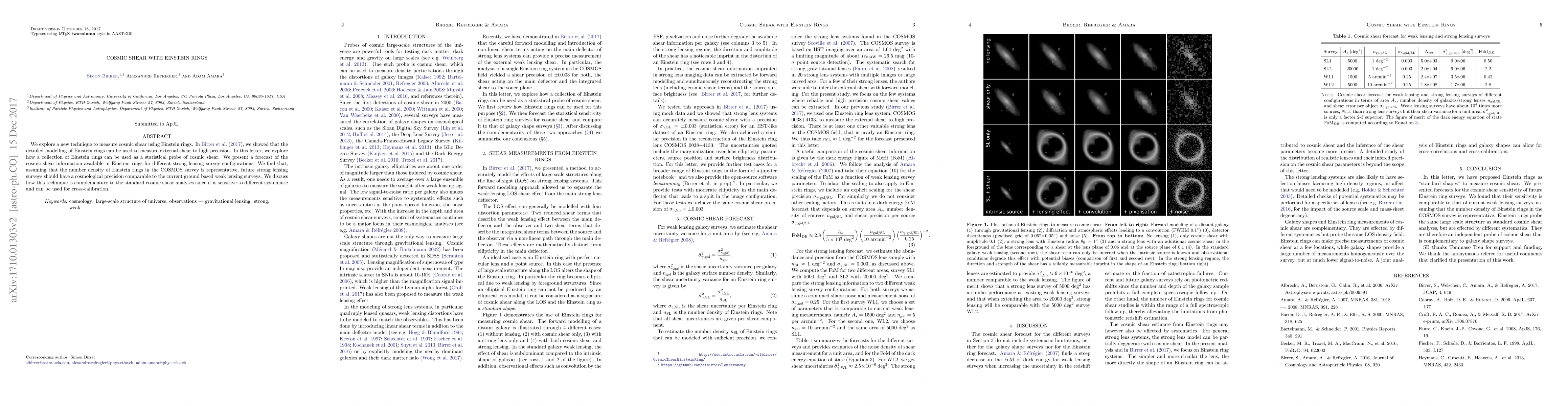 We explore a new technique to measure cosmic shear using Einstein rings. In Birrer et al. (2017), we showed that the detailed modelling of Einstein rings can be used to measure external shear to high precision. In this letter, we explore how a collection of Einstein rings can be used as a statistical probe of cosmic shear. We present a forecast of the cosmic shear information available in Einstein rings for different strong lensing survey configurations. We find that, assuming that the number density of Einstein rings in the COSMOS survey is representative, future strong lensing surveys should have a cosmological precision comparable to the current ground based weak lensing surveys. We discuss how this technique is complementary to the standard cosmic shear analyses since it is sensitive to different systematic and can be used for cross-calibration.