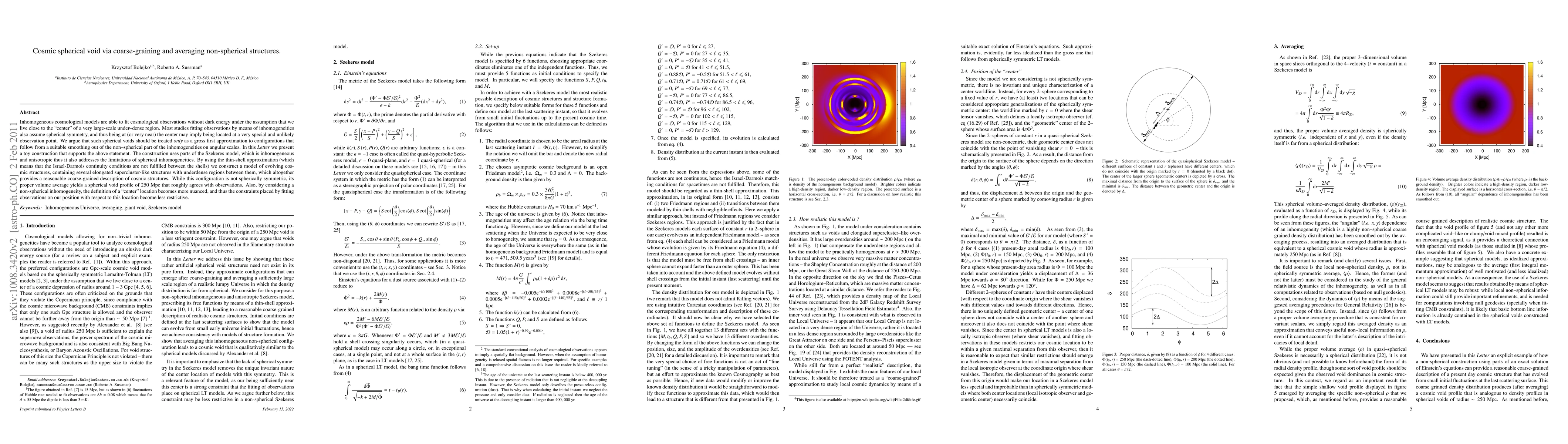 Inhomogeneous cosmological models are able to fit cosmological observations without dark energy under the assumption that we live close to the "center" of a very large-scale under-dense region. Most studies fitting observations by means of inhomogeneities also assume spherical symmetry, and thus being at (or very near) the center may imply being located at a very special and unlikely observation point. We argue that such spherical voids should be treated only as a gross first approximation to configurations that follow from a suitable smoothing out of the non-spherical part of the inhomogeneities on angular scales. In this Letter we present a toy construction that supports the above statement. The construction uses parts of the Szekeres model, which is inhomogeneous and anisotropic thus it also addresses the limitations of spherical inhomogeneities. By using the thin-shell approximation (which means that the Israel-Darmois continuity conditions are not fulfilled between the shells) we construct a model of evolving cosmic structures, containing several elongated supercluster-like structures with underdense regions between them, which altogether provides a reasonable coarse-grained description of cosmic structures. While this configuration is not spherically symmetric, its proper volume average yields a spherical void profile of 250 Mpc that roughly agrees with observations. Also, by considering a non-spherical inhomogeneity, the definition of a "center" location becomes more nuanced, and thus the constraints placed by fitting observations on our position with respect to this location become less restrictive.
