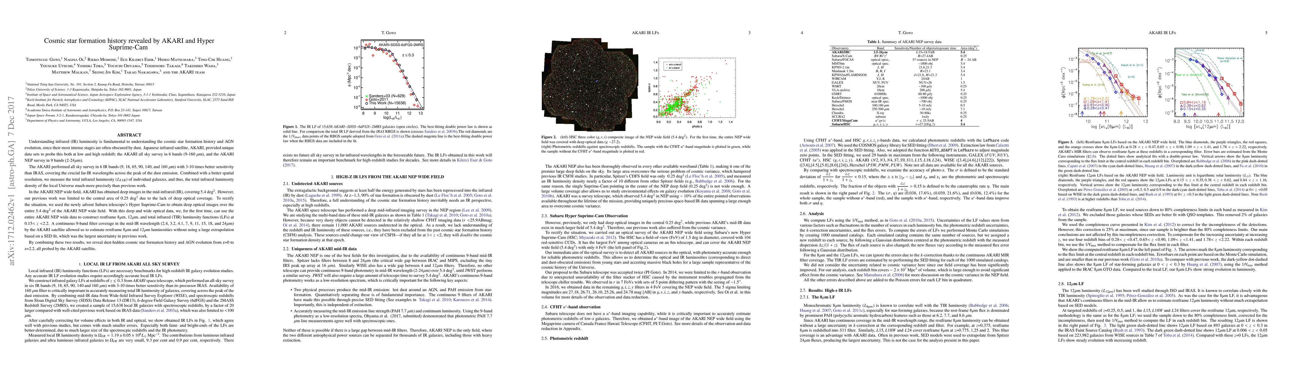 This paper combines data from the AKARI satellite and the Hyper Suprime-Cam on the Subaru telescope to construct infrared luminosity functions, revealing the dust-hidden cosmic star formation history and AGN evolution from z=0 to z=2.2. The improved sensitivity and spatial resolution of AKARI, along with deep optical coverage from Hyper Suprime-Cam, allow for more precise measurements of the total infrared luminosity density of the local Universe.