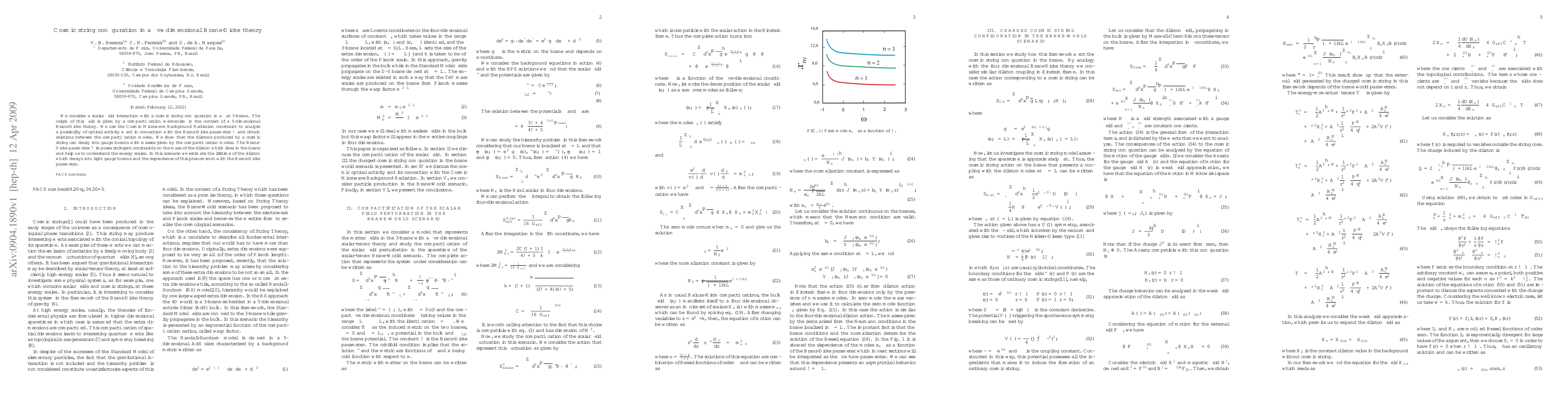 This paper explores the interaction of a scalar field with a cosmic string in a 3-brane within a 5-dimensional Brans-Dicke theory, using compactification mechanisms. It investigates the optical activity effect linked to the Brans-Dicke parameter w and derives relations between compactification modes, estimating the lifetime of dilatons decaying into light gauge bosons.
