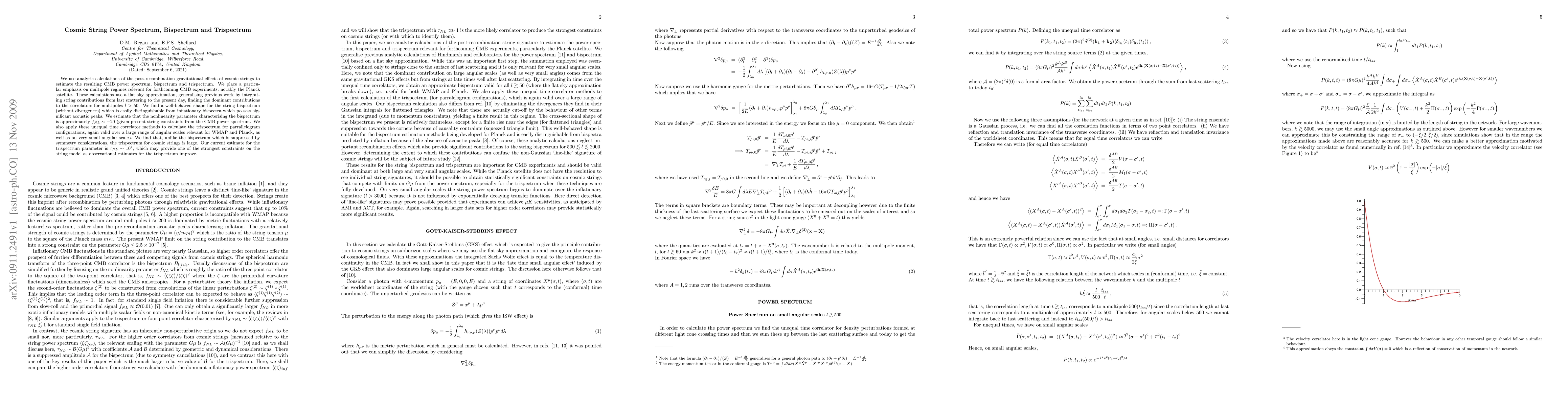 We use analytic calculations of the post-recombination gravitational effects of cosmic strings to estimate the resulting CMB power spectrum, bispectrum and trispectrum. We place a particular emphasis on multipole regimes relevant for forthcoming CMB experiments, notably the Planck satellite. These calculations use a flat sky approximation, generalising previous work by integrating string contributions from last scattering to the present day, finding the dominant contributions to the correlators for multipoles l > 50. We find a well-behaved shape for the string bispectrum (without divergences) which is easily distinguishable from the inflationary bispectra which possess significant acoustic peaks. We estimate that the nonlinearity parameter characterising the bispectrum is approximately f_NL \sim -20 (given present string constraints from the CMB power spectrum. We also apply these unequal time correlator methods to calculate the trispectrum for parrallelogram configurations, again valid over a large range of angular scales relevant for WMAP and Planck, as well as on very small angular scales. We find that, unlike the bispectrum which is suppressed by symmetry considerations, the trispectrum for cosmic strings is large. Our current estimate for the trispectrum parameter is tau_NL \sim 10^5, which may provide one of the strongest constraints on the string model as estimators for the trispectrum are developed.