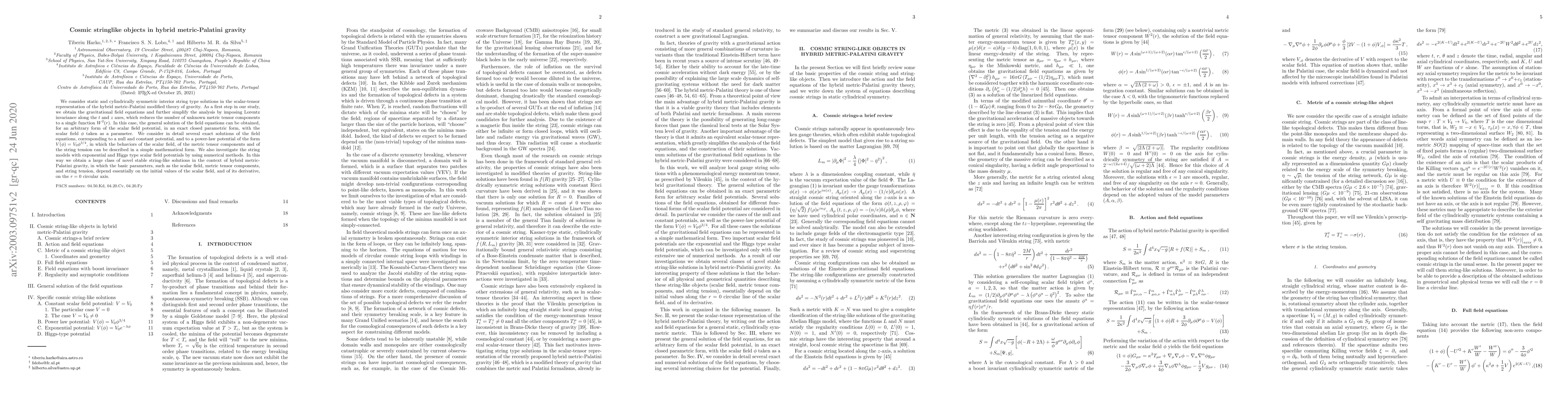 We consider static and cylindrically symmetric interior string type solutions in the scalar-tensor representation of the hybrid metric-Palatini modified theory of gravity. As a first step in our study, we obtain the gravitational field equations and further simplify the analysis by imposing Lorentz invariance along the $t$ and $z$ axes, which reduces the number of unknown metric tensor components to a single function $W^2(r)$. In this case, the general solution of the field equations can be obtained, for an arbitrary form of the scalar field potential, in an exact closed parametric form, with the scalar field $\phi$ taken as a parameter. We consider in detail several exact solutions of the field equations, corresponding to a null and constant potential, and to a power-law potential of the form $V(\phi)=V_0\phi ^{3/4}$, in which the behaviors of the scalar field, of the metric tensor components and of the string tension can be described in a simple mathematical form. We also investigate the string models with exponential and Higgs type scalar field potentials by using numerical methods. In this way we obtain a large class of novel stable string-like solutions in the context of hybrid metric-Palatini gravity, in which the basic parameters, such as the scalar field, metric tensor components, and string tension, depend essentially on the initial values of the scalar field, and of its derivative, on the $r=0$ circular axis.