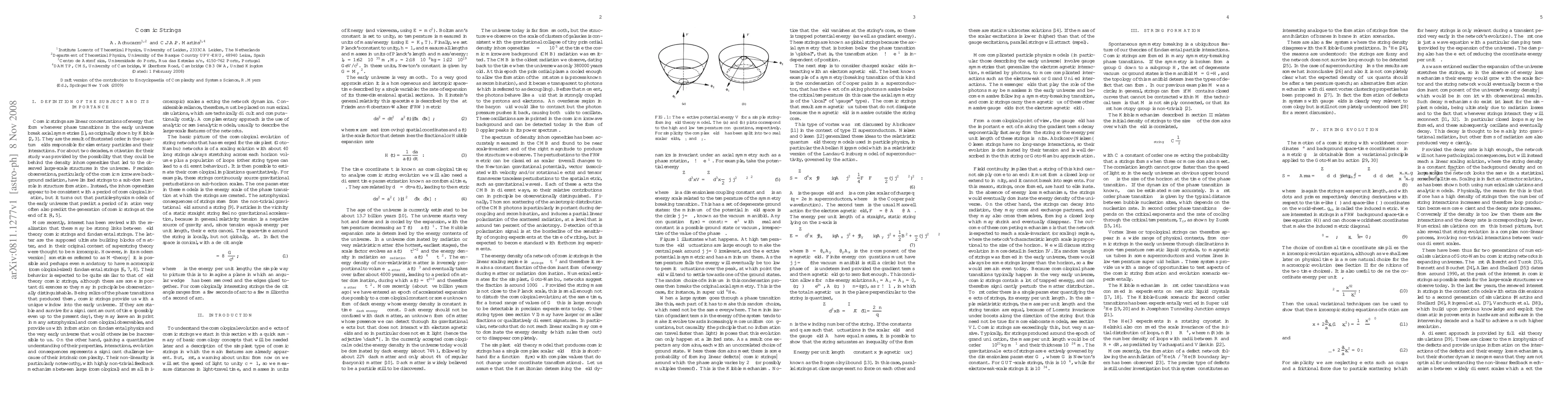 Cosmic strings are energy-dense linear formations from early universe phase transitions, once thought to contribute to large-scale cosmic structures. Recent interest has revived due to potential connections between cosmic strings and macroscopic fundamental strings in modern M-theory.