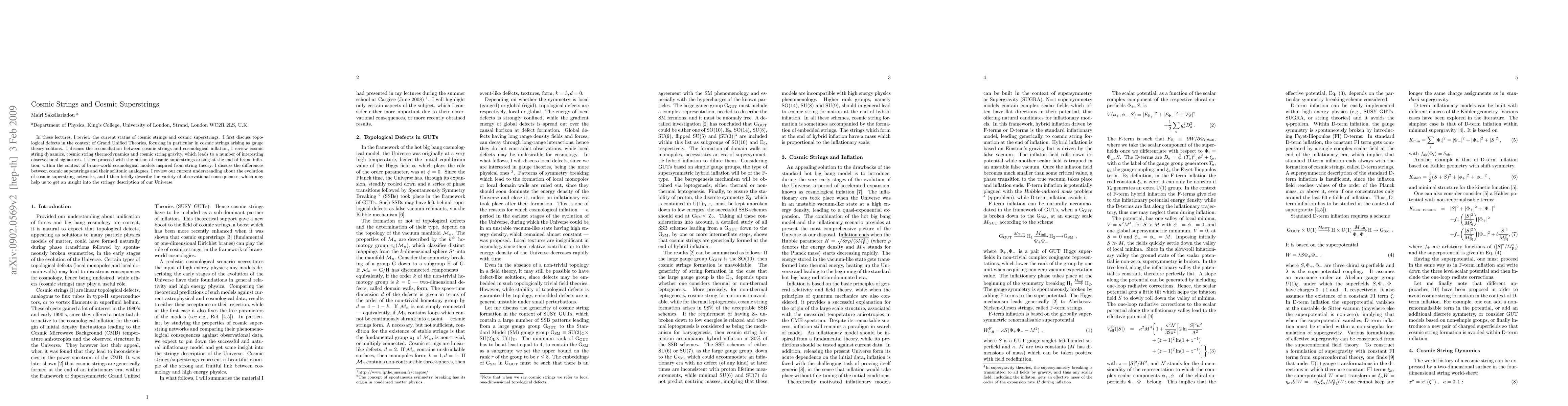 In these lectures, I review the current status of cosmic strings and cosmic superstrings. I first discuss topological defects in the context of Grand Unified Theories, focusing in particular in cosmic strings arising as gauge theory solitons. I discuss the reconciliation between cosmic strings and cosmological inflation, I review cosmic string dynamics, cosmic string thermodynamics and cosmic string gravity, which leads to a number of interesting observational signatures. I then proceed with the notion of cosmic superstrings arising at the end of brane inflation, within the context of brane-world cosmological models inspired from string theory. I discuss the differences between cosmic superstrings and their solitonic analogues, I review our current understanding about the evolution of cosmic superstring networks, and I then briefly describe the variety of observational consequences, which may help us to get an insight into the stringy description of our Universe.