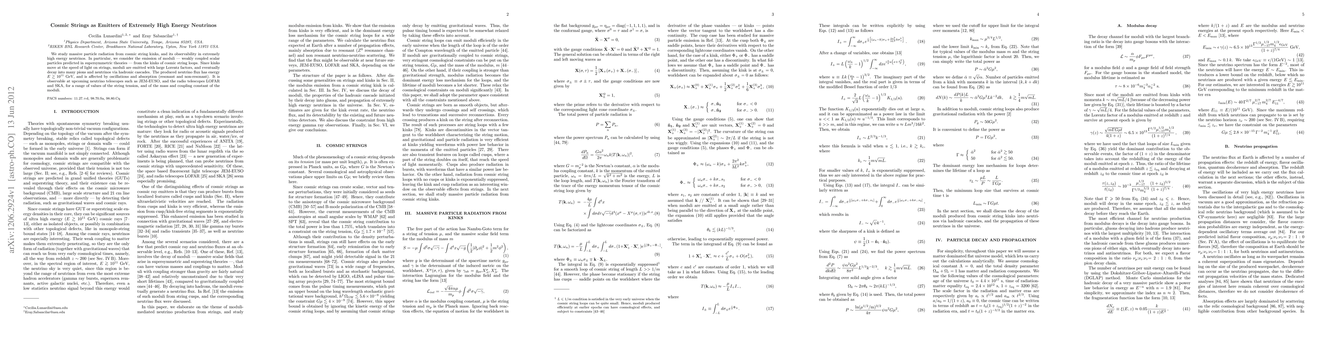 This paper investigates the emission of extremely high energy neutrinos from cosmic string kinks, focusing on moduli particles predicted in supersymmetric theories. The study finds that these neutrinos, with energies above $10^{11}$ GeV, could be detected by future neutrino and radio telescopes, providing a potential observational signature of cosmic strings.