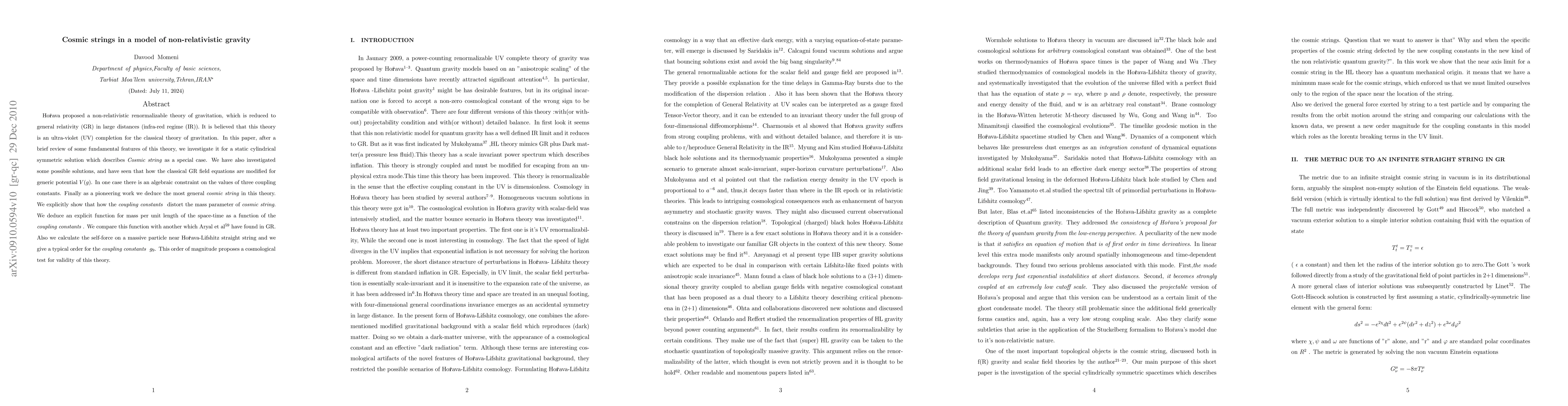 Ho$\check{\textbf{r}}$ava proposed a non-relativistic renormalizable theory of gravitation, which is reduced to general relativity (GR) in large distances (infra-red regime (IR)). It is believed that this theory is an ultra-violet (UV) completion for the classical theory of gravitation. In this paper, after a brief review of some fundamental features of this theory, we investigate it for a static cylindrical symmetric solution which describes \emph{Cosmic string} as a special case. We have also investigated some possible solutions, and have seen that how the classical GR field equations are modified for generic potential $V (g)$. In one case there is an algebraic constraint on the values of three coupling constants. Finally as a pioneering work we deduce the most general \emph{cosmic string} in this theory. We explicitly show that how the \emph{coupling constants} distort the mass parameter of \emph{cosmic string}. We deduce an explicit function for mass per unit length of the space-time as a function of the \emph{coupling constants}. We compare this function with another which Aryal et al [58] have found in GR.Also we calculate the self-force on a massive particle near Ho$\check{\textbf{r}}$ava-Lifshitz straight string and we give a typical order for the \emph{coupling constants} $g_{9}$. This order of magnitude proposes a cosmological test for validity of this theory.