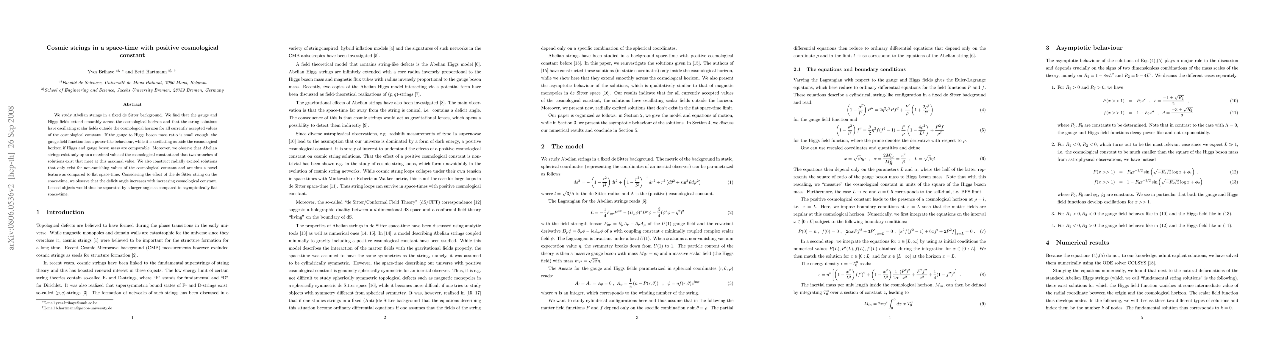 This paper investigates Abelian strings in a de Sitter space-time, revealing that gauge and Higgs fields extend across the cosmological horizon with oscillating scalar fields outside. It finds that Abelian strings exist only up to a maximal cosmological constant, with radially excited solutions unique to non-flat space-time.