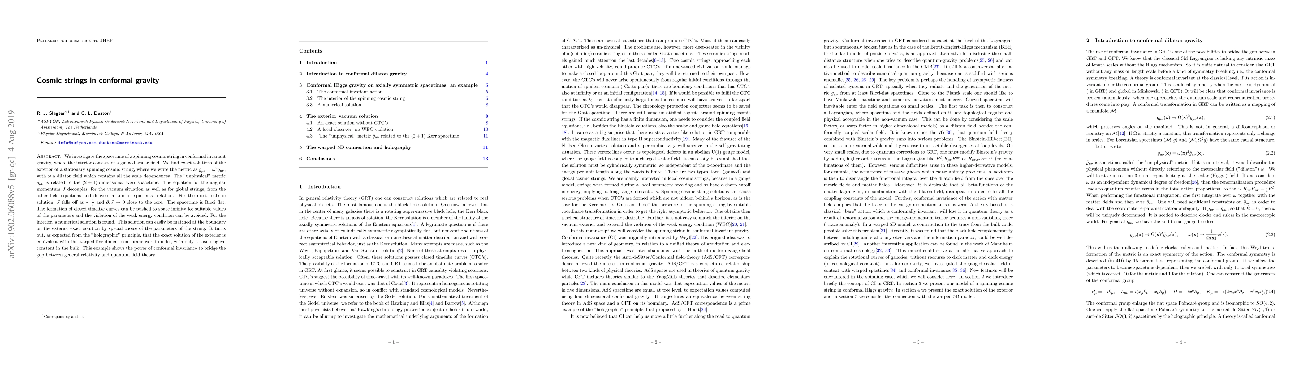 Researchers found a spinning cosmic string solution in conformal gravity that is equivalent to a warped five-dimensional brane world model with only a cosmological constant in the bulk, providing insight into bridging general relativity and quantum field theory.