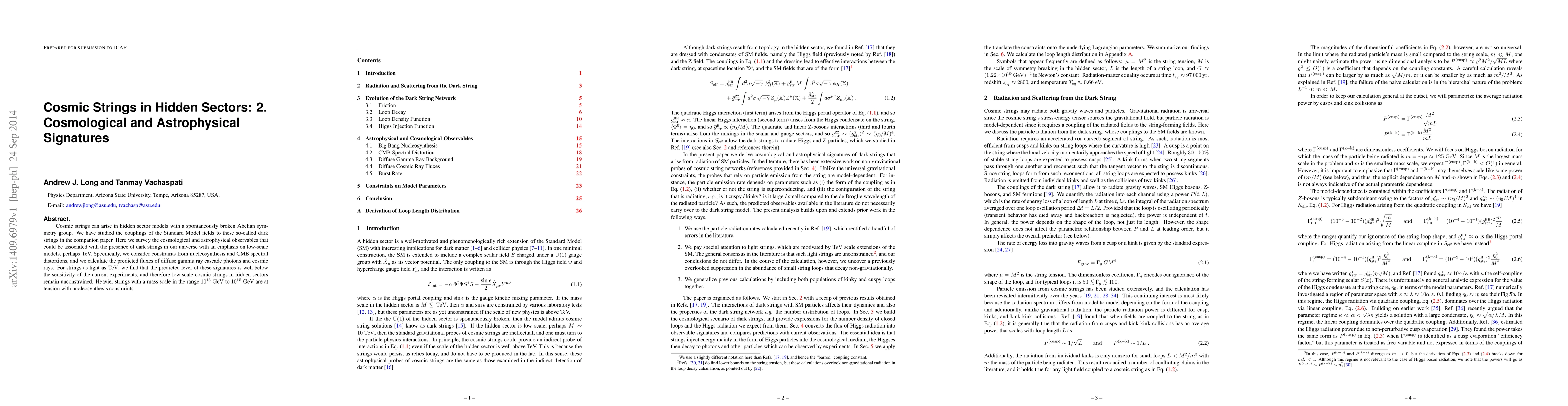 Cosmic strings can arise in hidden sector models with a spontaneously broken Abelian symmetry group. We have studied the couplings of the Standard Model fields to these so-called dark strings in the companion paper. Here we survey the cosmological and astrophysical observables that could be associated with the presence of dark strings in our universe with an emphasis on low-scale models, perhaps TeV. Specifically, we consider constraints from nucleosynthesis and CMB spectral distortions, and we calculate the predicted fluxes of diffuse gamma ray cascade photons and cosmic rays. For strings as light as TeV, we find that the predicted level of these signatures is well below the sensitivity of the current experiments, and therefore low scale cosmic strings in hidden sectors remain unconstrained. Heavier strings with a mass scale in the range 10^(13) GeV to 10^(15) GeV are at tension with nucleosynthesis constraints.