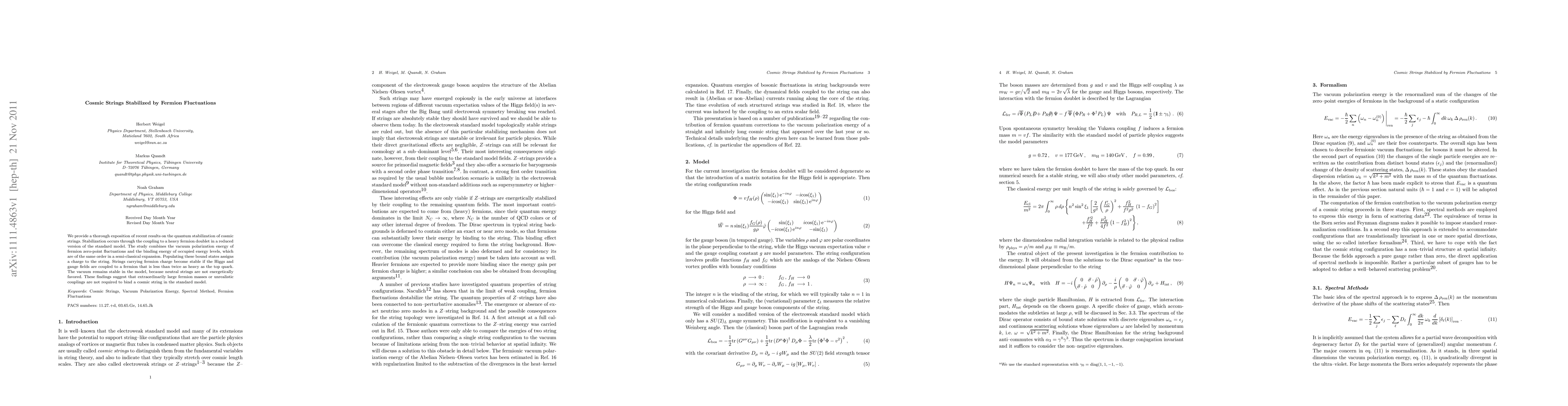 We provide a thorough exposition of recent results on the quantum stabilization of cosmic strings. Stabilization occurs through the coupling to a heavy fermion doublet in a reduced version of the standard model. The study combines the vacuum polarization energy of fermion zero-point fluctuations and the binding energy of occupied energy levels, which are of the same order in a semi-classical expansion. Populating these bound states assigns a charge to the string. Strings carrying fermion charge become stable if the Higgs and gauge fields are coupled to a fermion that is less than twice as heavy as the top quark. The vacuum remains stable in the model, because neutral strings are not energetically favored. These findings suggest that extraordinarily large fermion masses or unrealistic couplings are not required to bind a cosmic string in the standard model.