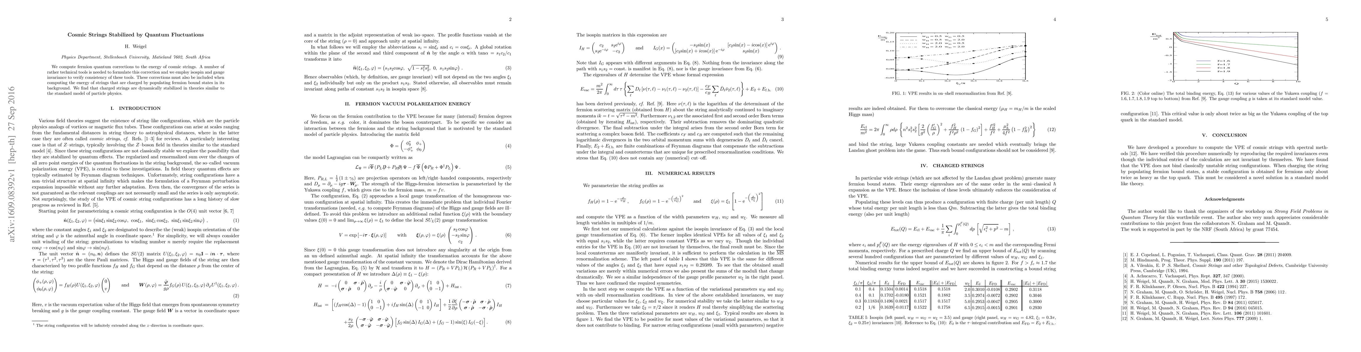 This paper calculates fermion quantum corrections to cosmic string energy, employing isospin and gauge invariance for consistency. It finds that charged cosmic strings are dynamically stabilized in theories akin to the standard model of particle physics.