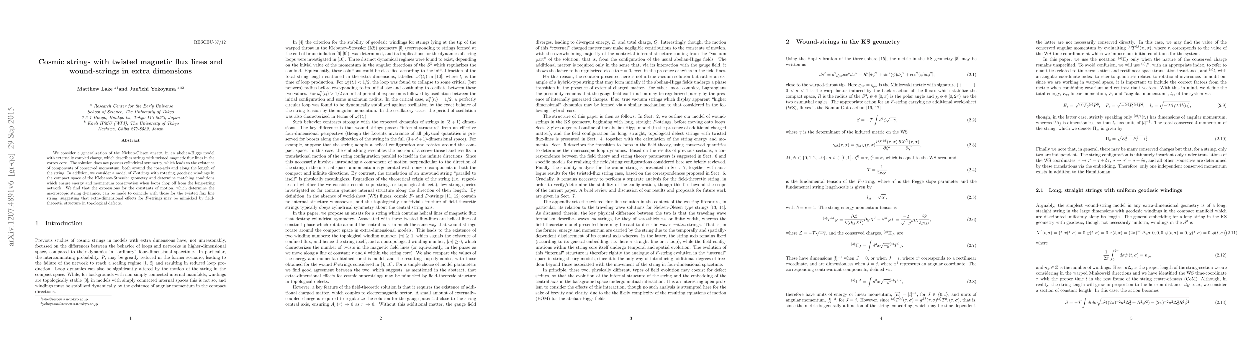 This research generalizes the Nielsen-Olesen ansatz in an abelian-Higgs model to describe cosmic strings with twisted magnetic flux lines, revealing non-cylindrical symmetry and conserved momentum components. It also examines F-strings in extra dimensions, showing that their dynamics can be matched with those of twisted flux line strings, indicating that extra-dimensional effects may be replicated by field-theoretic structures.