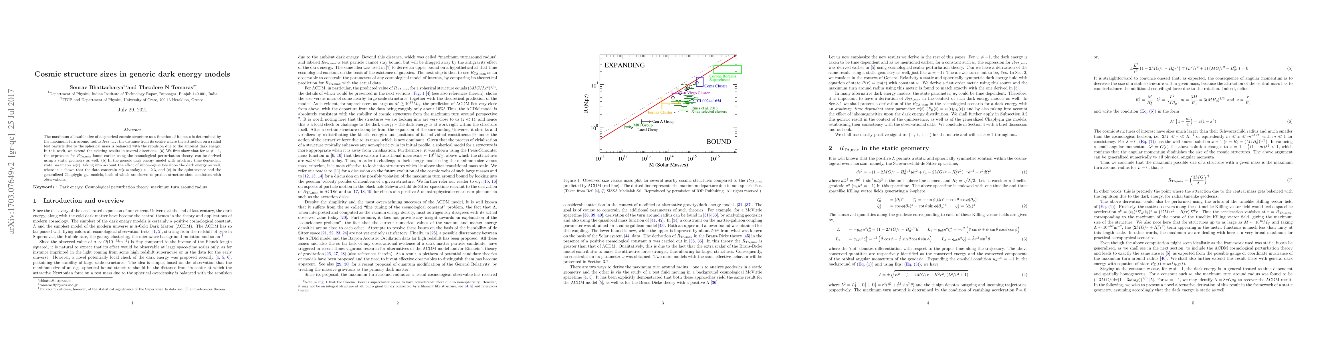 The maximum allowable size of a spherical cosmic structure as a function of its mass is determined by the maximum turn around radius $R_{\rm TA,max}$, the distance from its centre where the attraction on a radial test particle due to the spherical mass is balanced with the repulsion due to the ambient dark energy. In this work, we extend the existing results in several directions. (a) We first show that for $w\neq -1$, the expression for $R_{\rm TA, max}$ found earlier using the cosmological perturbation theory, can be derived using a static geometry as well. (b) In the generic dark energy model with arbitrary time dependent state parameter $w(t)$, taking into account the effect of inhomogeneities upon the dark energy as well, where it is shown that the data constrain $w(t={\rm today})>-2.3$, and (c) in the quintessence and the generalized Chaplygin gas models, both of which are shown to predict structure sizes consistent with observations.