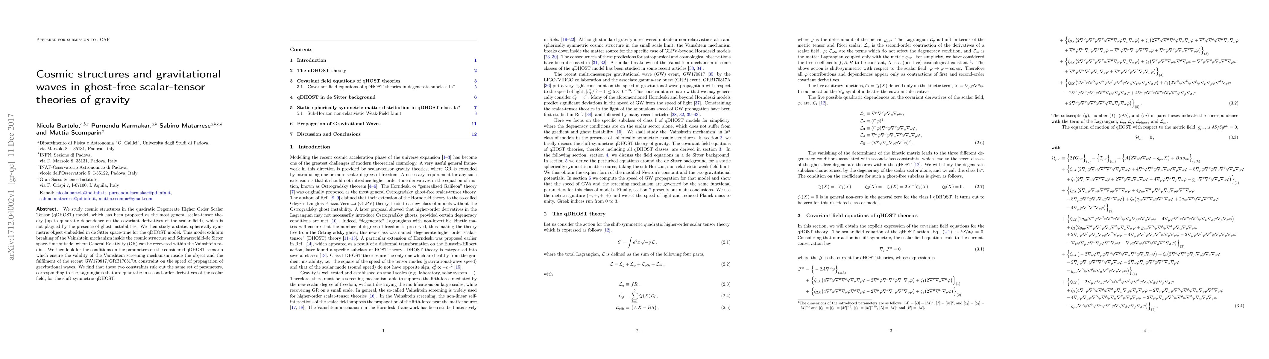 We study cosmic structures in the quadratic Degenerate Higher Order Scalar Tensor (qDHOST) model, which has been proposed as the most general scalar-tensor theory (up to quadratic dependence on the covariant derivatives of the scalar field), which is not plagued by the presence of ghost instabilities. We then study a static, spherically symmetric object embedded in de Sitter space-time for the qDHOST model. This model exhibits breaking of the Vainshtein mechanism inside the cosmic structure and Schwarzschild-de Sitter space-time outside, where General Relativity (GR) can be recovered within the Vainshtein radius. We then look for the conditions on the parameters on the considered qDHOST scenario which ensure the validity of the Vainshtein screening mechanism inside the object and the fulfilment of the recent GW170817/GRB170817A constraint on the speed of propagation of gravitational waves. We find that these two constraints rule out the same set of parameters, corresponding to the Lagrangians that are quadratic in second-order derivatives of the scalar field, for the shift symmetric qDHOST.