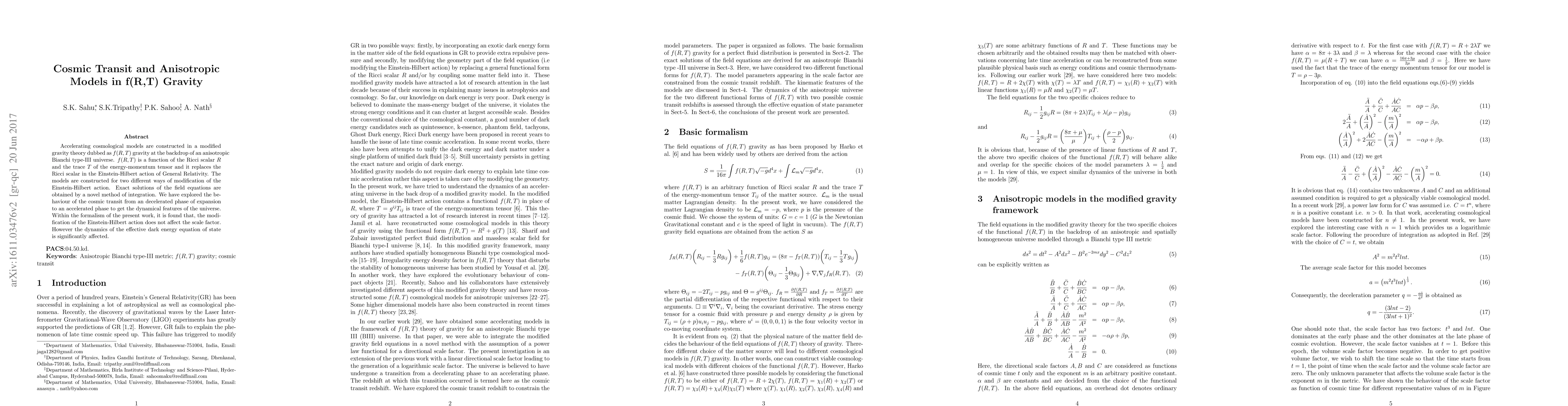 Accelerating cosmological models are constructed in a modified gravity theory dubbed as $f(R,T)$ gravity at the backdrop of an anisotropic Bianchi type-III universe. $f(R,T)$ is a function of the Ricci scalar $R$ and the trace $T$ of the energy-momentum tensor and it replaces the Ricci scalar in the Einstein-Hilbert action of General Relativity. The models are constructed for two different ways of modification of the Einstein-Hilbert action. Exact solutions of the field equations are obtained by a novel method of integration. We have explored the behaviour of the cosmic transit from an decelerated phase of expansion to an accelerated phase to get the dynamical features of the universe. Within the formalism of the present work, it is found that, the modification of the Einstein-Hilbert action does not affect the scale factor. However the dynamics of the effective dark energy equation of state is significantly affected.