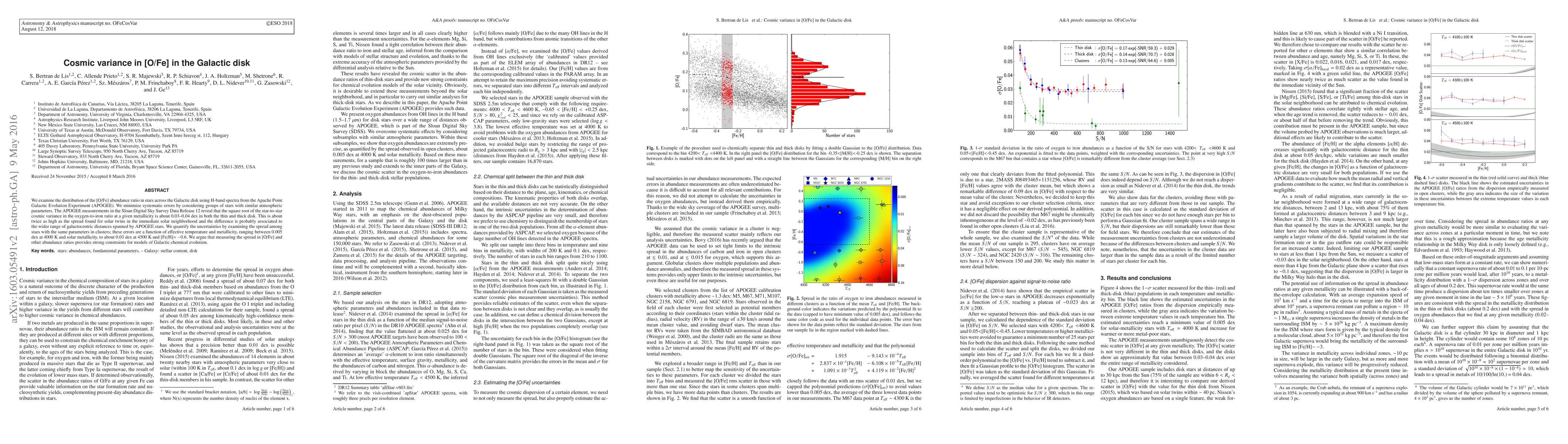 We examine the distribution of the [O/Fe] abundance ratio in stars across the Galactic disk using H-band spectra from the Apache Point Galactic Evolution Experiment (APOGEE). We minimize systematic errors by considering groups of stars with similar atmospheric parameters. The APOGEE measurements in the Sloan Digital Sky Survey Data Release 12 reveal that the square root of the star-to-star cosmic variance in the oxygen-to-iron ratio at a given metallicity is about 0.03-0.04 dex in both the thin and thick disk. This is about twice as high as the spread found for solar twins in the immediate solar neighborhood and the difference is probably associated to the wider range of galactocentric distances spanned by APOGEE stars. We quantify the uncertainties by examining the spread among stars with the same parameters in clusters; these errors are a function of effective temperature and metallicity, ranging between 0.005 dex at 4000 K and solar metallicity, to about 0.03 dex at 4500 K and [Fe/H]= -0.6. We argue that measuring the spread in [O/Fe] and other abundance ratios provides strong constraints for models of Galactic chemical evolution.
