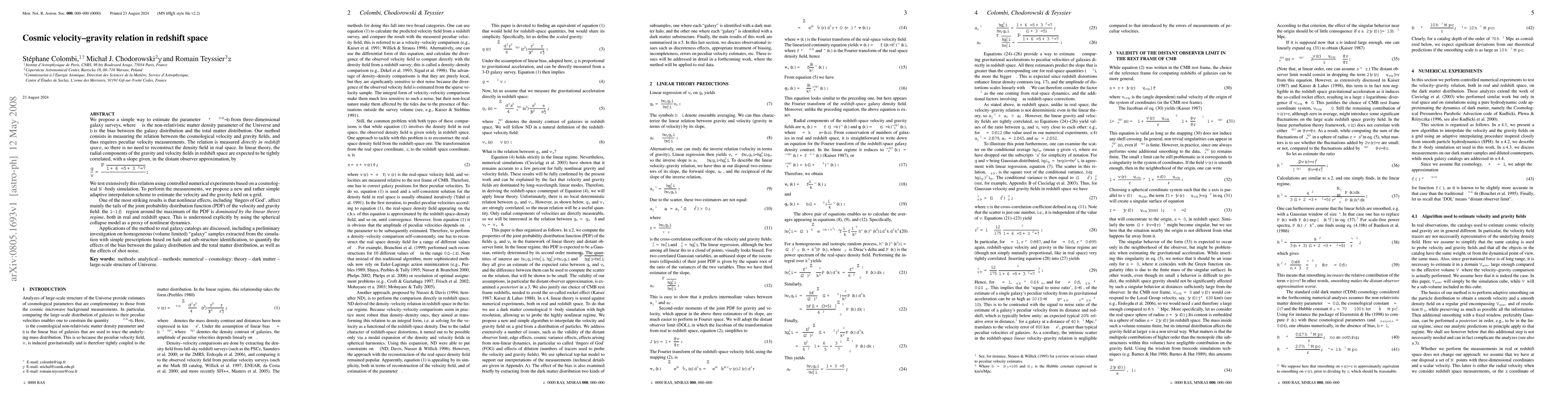 We propose a simple way to estimate the parameter beta = Omega_m^(0.6)/b from three-dimensional galaxy surveys. Our method consists in measuring the relation between the cosmological velocity and gravity fields, and thus requires peculiar velocity measurements. The relation is measured *directly in redshift space*, so there is no need to reconstruct the density field in real space. In linear theory, the radial components of the gravity and velocity fields in redshift space are expected to be tightly correlated, with a slope given, in the distant observer approximation, by g / v = (1 + 6 beta / 5 + 3 beta^2 / 7)^(1/2) / beta. We test extensively this relation using controlled numerical experiments based on a cosmological N-body simulation. To perform the measurements, we propose a new and rather simple adaptive interpolation scheme to estimate the velocity and the gravity field on a grid. One of the most striking results is that nonlinear effects, including `fingers of God', affect mainly the tails of the joint probability distribution function (PDF) of the velocity and gravity field: the 1--1.5 sigma region around the maximum of the PDF is *dominated by the linear theory regime*, both in real and redshift space. This is understood explicitly by using the spherical collapse model as a proxy of nonlinear dynamics. Applications of the method to real galaxy catalogs are discussed, including a preliminary investigation on homogeneous (volume limited) `galaxy' samples extracted from the simulation with simple prescriptions based on halo and sub-structure identification, to quantify the effects of the bias between the galaxy and the total matter distibution, and of shot noise (ABRIDGED).