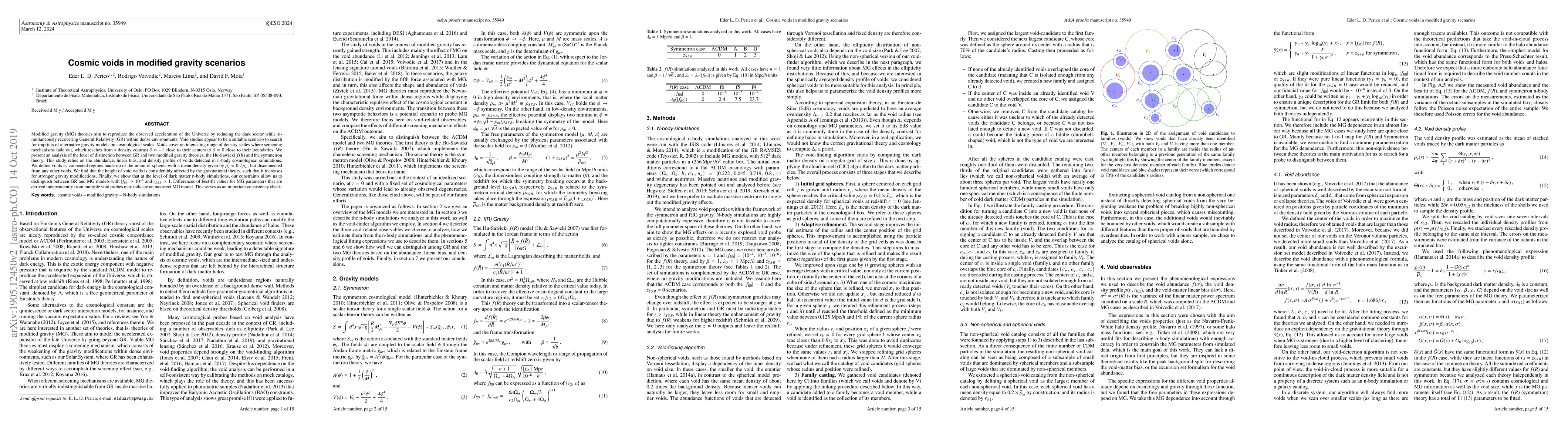 Modified gravity (MG) theories aim to reproduce the observed acceleration of the Universe by reducing the dark sector while simultaneously recovering General Relativity (GR) within dense environments. Void studies appear to be a suitable scenario to search for imprints of alternative gravity models on cosmological scales. Voids cover an interesting range of density scales where screening mechanisms fade out, which reaches from a density contrast $\delta \approx -1$ close to their centers to $\delta \approx 0$ close to their boundaries. We present an analysis of the level of distinction between GR and two modified gravity theories, the Hu-Sawicki $f(R)$ and the symmetron theory. This study relies on the abundance, linear bias, and density profile of voids detected in n-body cosmological simulations. We define voids as connected regions made up of the union of spheres with a {\it \textup{mean}} density given by $\overline\rho_v=0.2\,\overline\rho_m$, but disconnected from any other voids. We find that the height of void walls is considerably affected by the gravitational theory, such that it increases for stronger gravity modifications. Finally, we show that at the level of dark matter n-body simulations, our constraints allow us to distinguish between GR and MG models with $|f_{R0}| > 10^{-6}$ and $z_{SSB} > 1$. Differences of best-fit values for MG parameters that are derived independently from multiple void probes may indicate an incorrect MG model. This serves as an important consistency check.