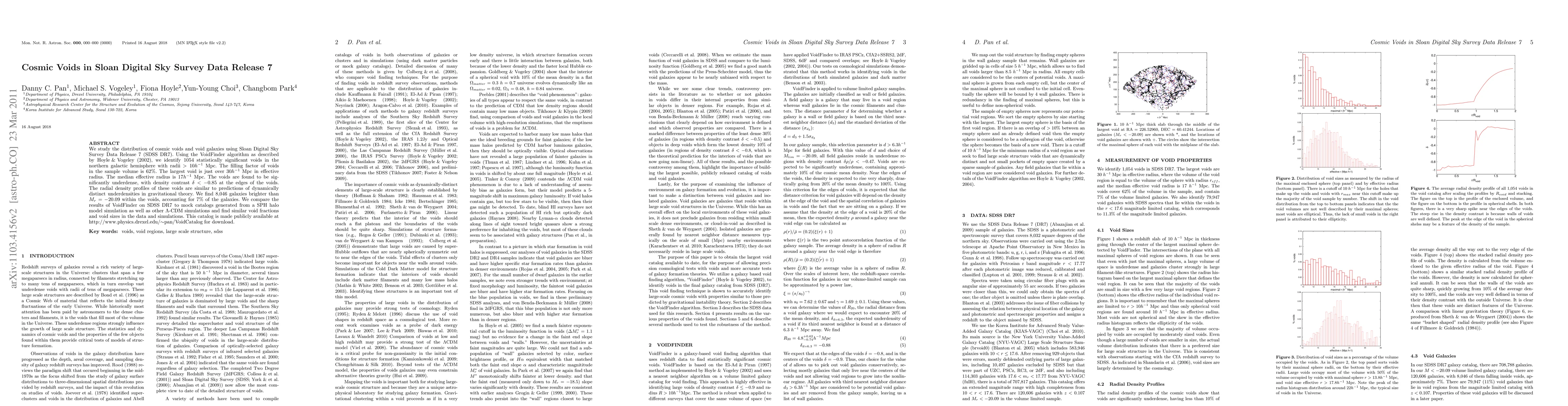This study maps 1054 cosmic voids in Sloan Digital Sky Survey Data Release 7, finding that they are underdense regions with density contrasts less than -0.85. The voids contain 8,046 galaxies, accounting for 7% of the total galaxy population.