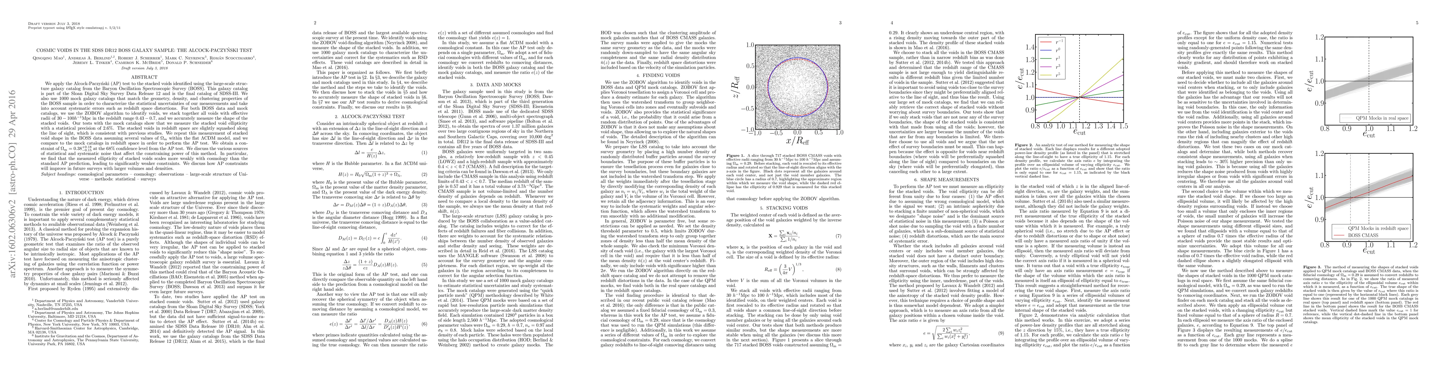 This paper applies the Alcock-Paczynski test to stacked voids identified in the BOSS galaxy sample from the SDSS DR12, finding $\Omega_m = 0.38^{+0.18}_{-0.15}$ at 68% confidence. The study uses the ZOBOV algorithm to identify voids and mock catalogs to assess uncertainties, revealing that the method's constraining power is weaker than expected due to systematic effects.