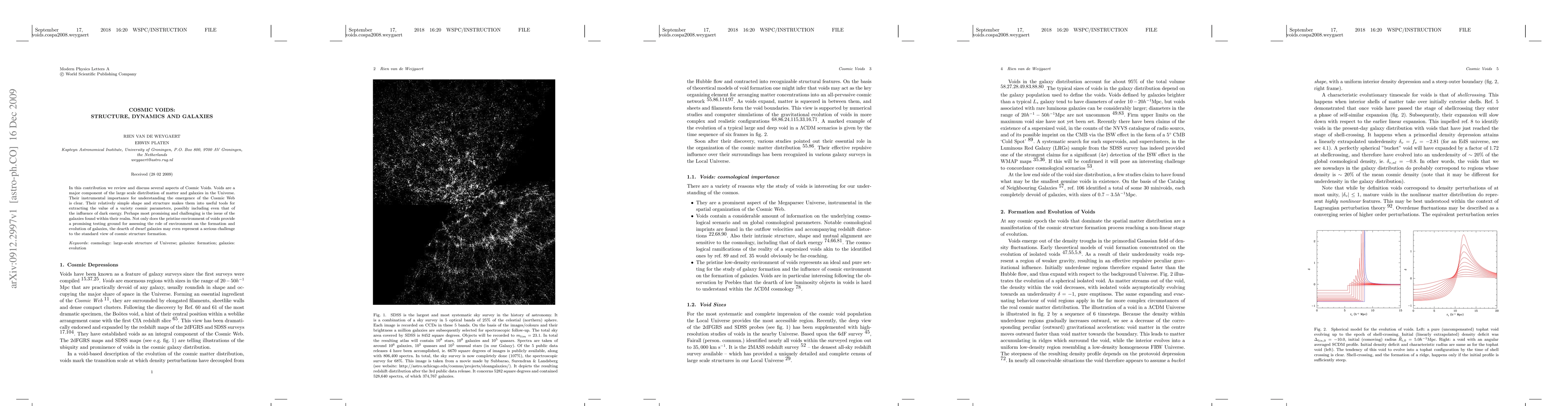In this review we discuss several aspects of Cosmic Voids. Voids are a major component of the large scale distribution of matter and galaxies in the Universe. They are of instrumental importance for understanding the emergence of the Cosmic Web. Their relatively simple shape and structure makes them into useful tools for extracting the value of a variety cosmic parameters, possibly including even that of the influence of dark energy. Perhaps most promising and challenging is the issue of the galaxies found within their realm. Not only does the pristine environment of voids provide a promising testing ground for assessing the role of environment on the formation and evolution of galaxies, the dearth of dwarf galaxies may even represent a serious challenge to the standard view of cosmic structure formation.