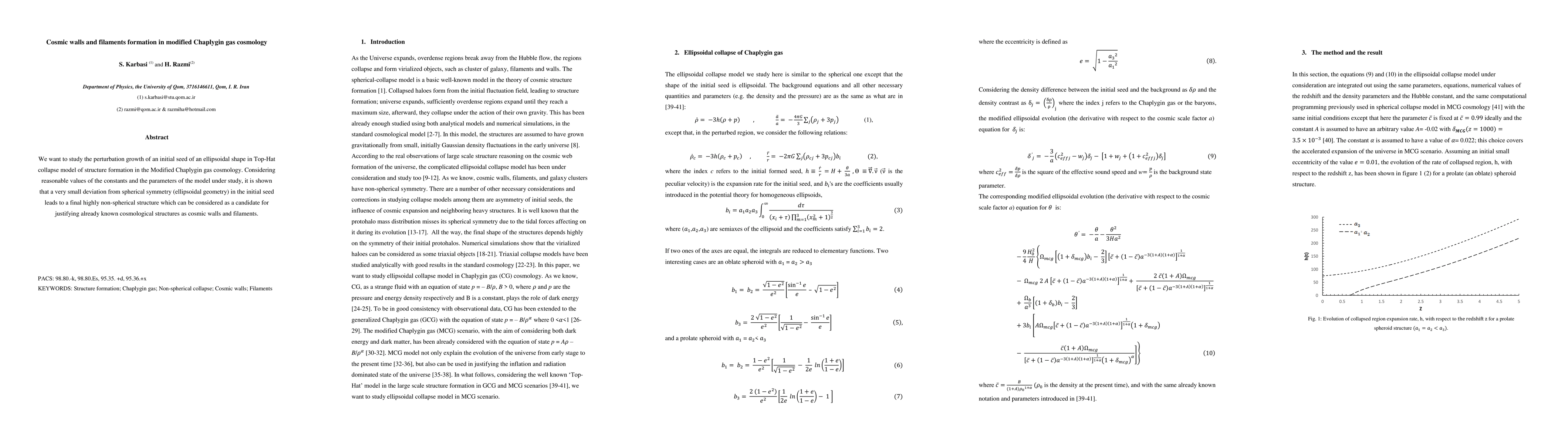 This paper investigates the formation of cosmic walls and filaments in a Modified Chaplygin gas cosmology by examining the growth of ellipsoidal perturbations in the Top-Hat collapse model. The study finds that slight deviations from spherical symmetry in the initial seed lead to highly non-spherical structures, potentially explaining known cosmological structures.
