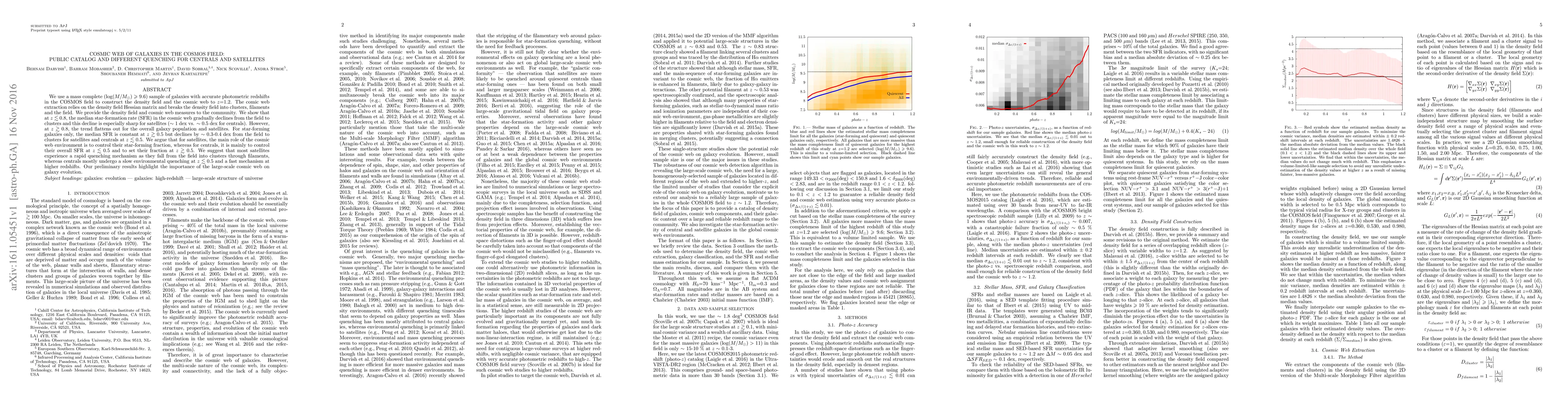 We use a mass complete (log($M/M_{\odot}$) $\geqslant$ 9.6) sample of galaxies with accurate photometric redshifts in the COSMOS field to construct the density field and the cosmic web to $z$=1.2. The comic web extraction relies on the density field Hessian matrix and breaks the density field into clusters, filaments and the field. We provide the density field and cosmic web measures to the community. We show that at $z$ $\lesssim$ 0.8, the median star-formation rate (SFR) in the cosmic web gradually declines from the field to clusters and this decline is especially sharp for satellites ($\sim$ 1 dex vs. $\sim$ 0.5 dex for centrals). However, at $z$ $\gtrsim$ 0.8, the trend flattens out for the overall galaxy population and satellites. For star-forming galaxies only, the median SFR is constant at $z$ $\gtrsim$ 0.5 but declines by $\sim$ 0.3-0.4 dex from the field to clusters for satellites and centrals at $z$ $\lesssim$ 0.5. We argue that for satellites, the main role of the cosmic web environment is to control their star-forming fraction, whereas for centrals, it is mainly to control their overall SFR at $z$ $\lesssim$ 0.5 and to set their fraction at $z$ $\gtrsim$ 0.5. We suggest that most satellites experience a rapid quenching mechanism as they fall from the field into clusters through filaments, whereas centrals mostly undergo a slow environmental quenching at $z$ $\lesssim$ 0.5 and a fast mechanism at higher redshifts. Our preliminary results highlight the importance of the large-scale cosmic web on galaxy evolution.