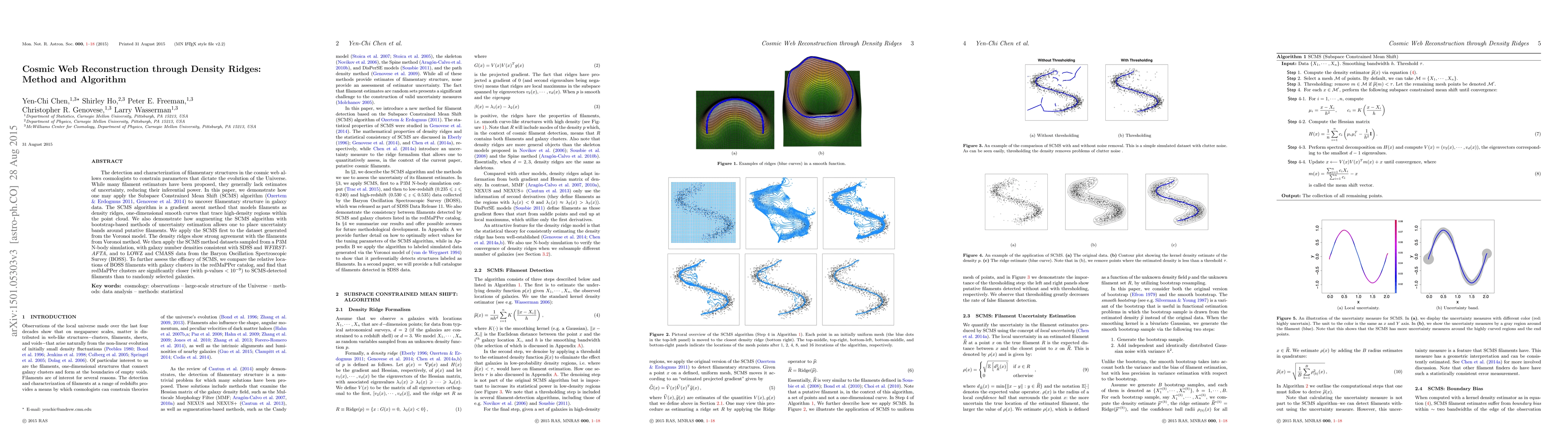 The detection and characterization of filamentary structures in the cosmic web allows cosmologists to constrain parameters that dictates the evolution of the Universe. While many filament estimators have been proposed, they generally lack estimates of uncertainty, reducing their inferential power. In this paper, we demonstrate how one may apply the Subspace Constrained Mean Shift (SCMS) algorithm (Ozertem and Erdogmus (2011); Genovese et al. (2012)) to uncover filamentary structure in galaxy data. The SCMS algorithm is a gradient ascent method that models filaments as density ridges, one-dimensional smooth curves that trace high-density regions within the point cloud. We also demonstrate how augmenting the SCMS algorithm with bootstrap-based methods of uncertainty estimation allows one to place uncertainty bands around putative filaments. We apply the SCMS method to datasets sampled from the P3M N-body simulation, with galaxy number densities consistent with SDSS and WFIRST-AFTA and to LOWZ and CMASS data from the Baryon Oscillation Spectroscopic Survey (BOSS). To further assess the efficacy of SCMS, we compare the relative locations of BOSS filaments with galaxy clusters in the redMaPPer catalog, and find that redMaPPer clusters are significantly closer (with p-values $< 10^{-9}$) to SCMS-detected filaments than to randomly selected galaxies.