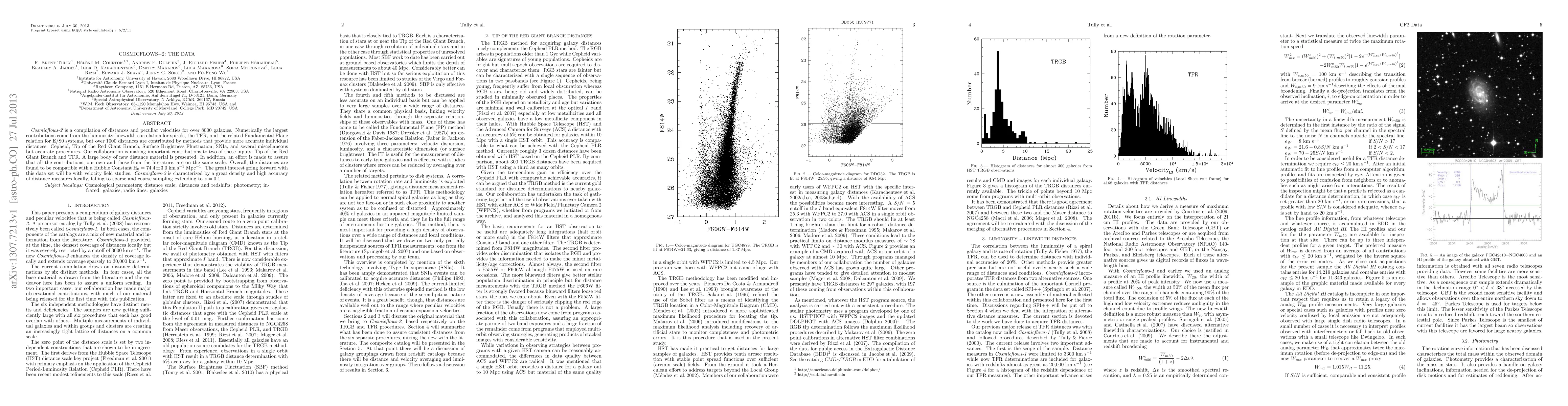 Cosmicflows-2 provides distances and peculiar velocities for over 8000 galaxies, combining various methods including TFR, Cepheid, and SNIa. The dataset supports a Hubble Constant of 74.4 ± 3.0 km/s/Mpc, offering high-density, accurate local distance measures that gradually become sparser at z=0.1, crucial for upcoming velocity field studies.