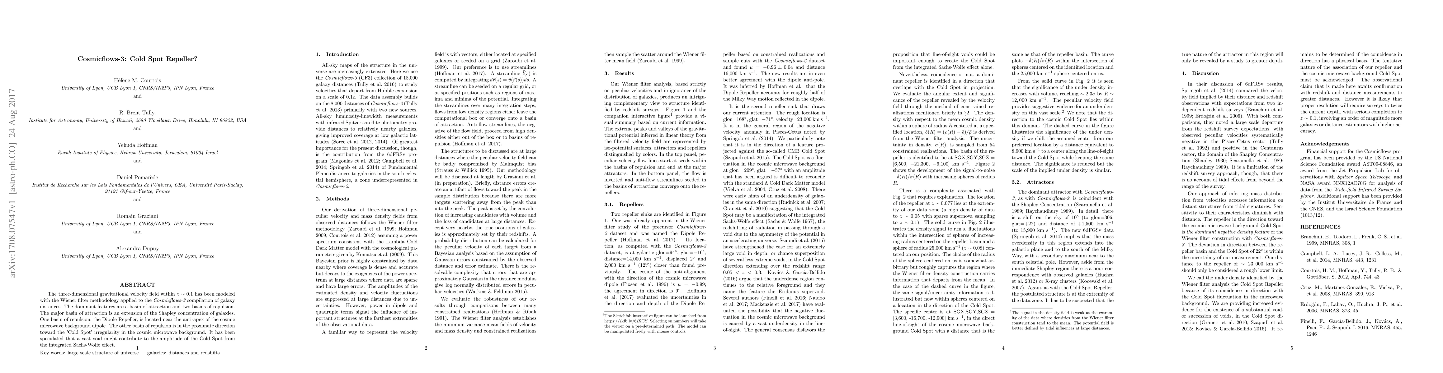 The three-dimensional gravitational velocity field within z~0.1 has been modeled with the Wiener filter methodology applied to the Cosmicflows-3 compilation of galaxy distances. The dominant features are a basin of attraction and two basins of repulsion. The major basin of attraction is an extension of the Shapley concentration of galaxies. One basin of repulsion, the Dipole Repeller, is located near the anti-apex of the cosmic microwave background dipole. The other basin of repulsion is in the proximate direction toward the 'Cold Spot' irregularity in the cosmic microwave background. It has been speculated that a vast void might contribute to the amplitude of the Cold Spot from the integrated Sachs-Wolfe effect.