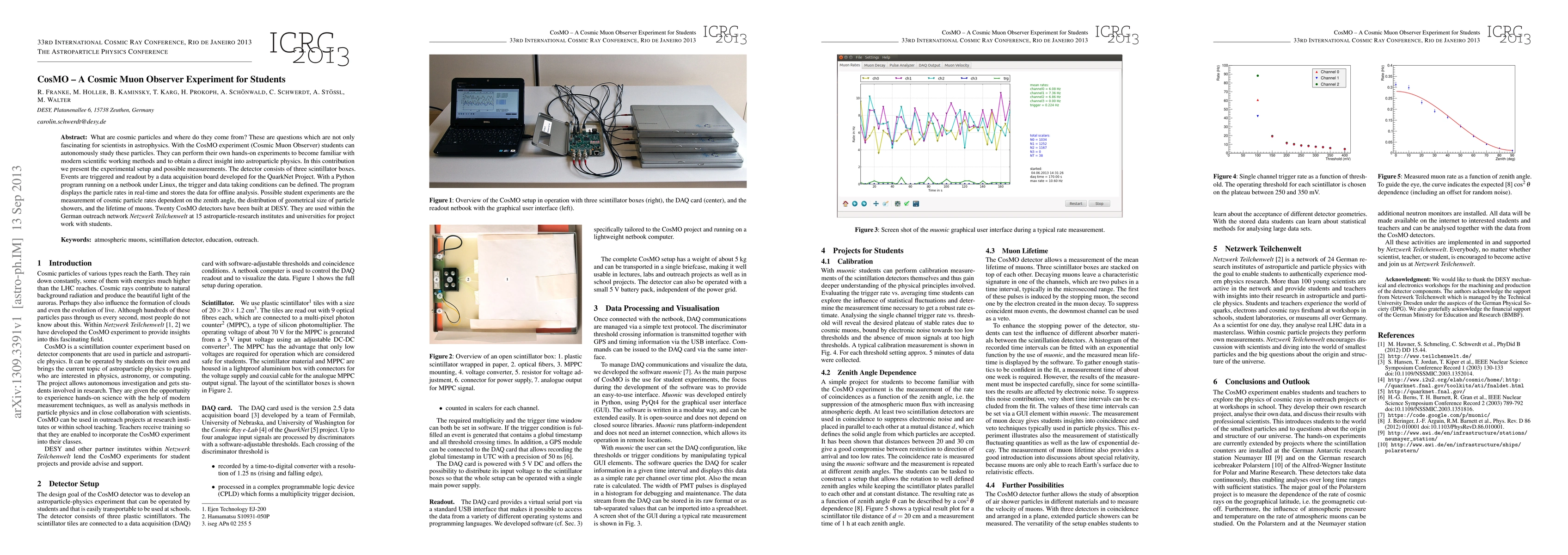 The CosMO experiment allows students to autonomously study cosmic muons through hands-on experiments, providing insight into astroparticle physics. The setup includes three scintillator boxes and a data acquisition board, with a Python program for real-time data display and storage.