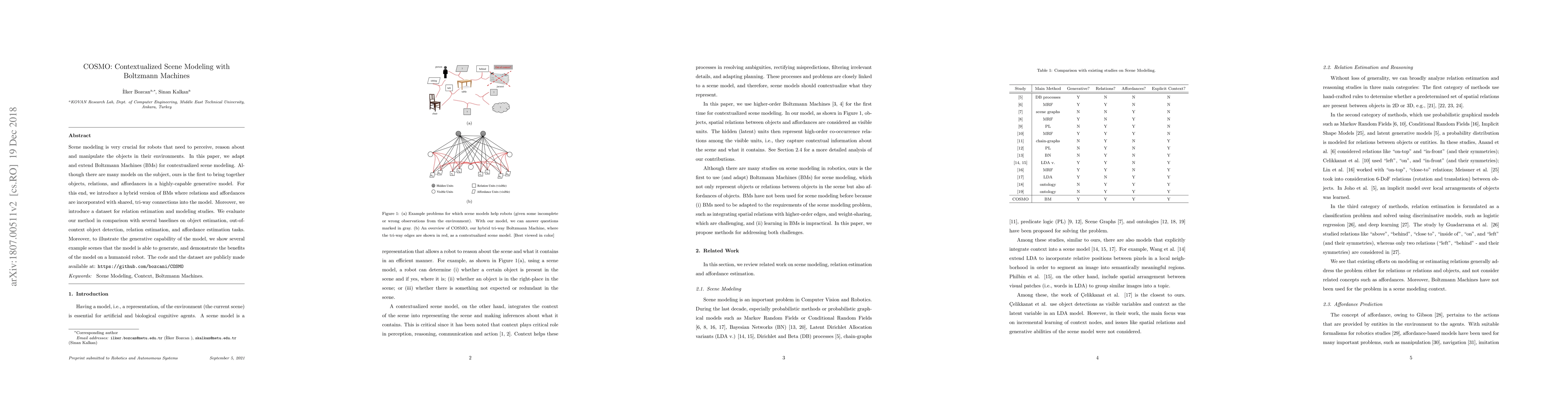 Scene modeling is very crucial for robots that need to perceive, reason about and manipulate the objects in their environments. In this paper, we adapt and extend Boltzmann Machines (BMs) for contextualized scene modeling. Although there are many models on the subject, ours is the first to bring together objects, relations, and affordances in a highly-capable generative model. For this end, we introduce a hybrid version of BMs where relations and affordances are introduced with shared, tri-way connections into the model. Moreover, we contribute a dataset for relation estimation and modeling studies. We evaluate our method in comparison with several baselines on object estimation, out-of-context object detection, relation estimation, and affordance estimation tasks. Moreover, to illustrate the generative capability of the model, we show several example scenes that the model is able to generate.