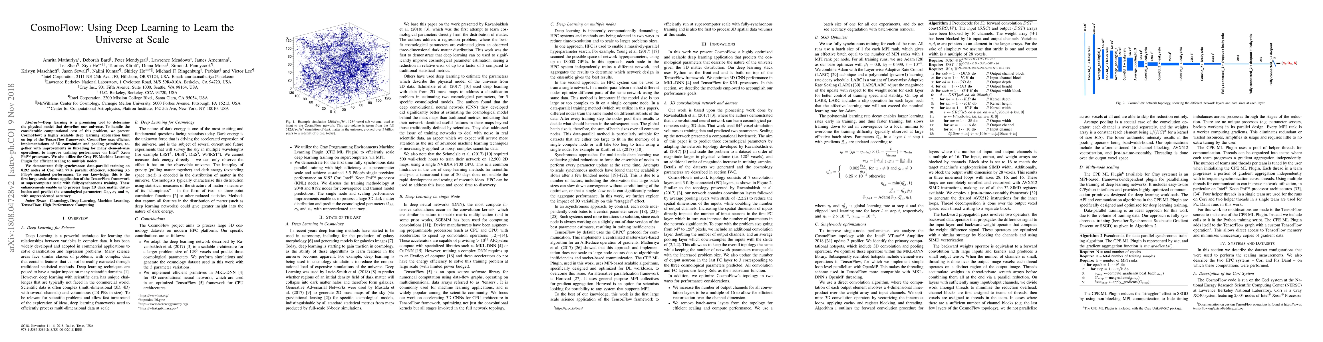 Deep learning is a promising tool to determine the physical model that describes our universe. To handle the considerable computational cost of this problem, we present CosmoFlow: a highly scalable deep learning application built on top of the TensorFlow framework. CosmoFlow uses efficient implementations of 3D convolution and pooling primitives, together with improvements in threading for many element-wise operations, to improve training performance on Intel(C) Xeon Phi(TM) processors. We also utilize the Cray PE Machine Learning Plugin for efficient scaling to multiple nodes. We demonstrate fully synchronous data-parallel training on 8192 nodes of Cori with 77% parallel efficiency, achieving 3.5 Pflop/s sustained performance. To our knowledge, this is the first large-scale science application of the TensorFlow framework at supercomputer scale with fully-synchronous training. These enhancements enable us to process large 3D dark matter distribution and predict the cosmological parameters $\Omega_M$, $\sigma_8$ and n$_s$ with unprecedented accuracy.