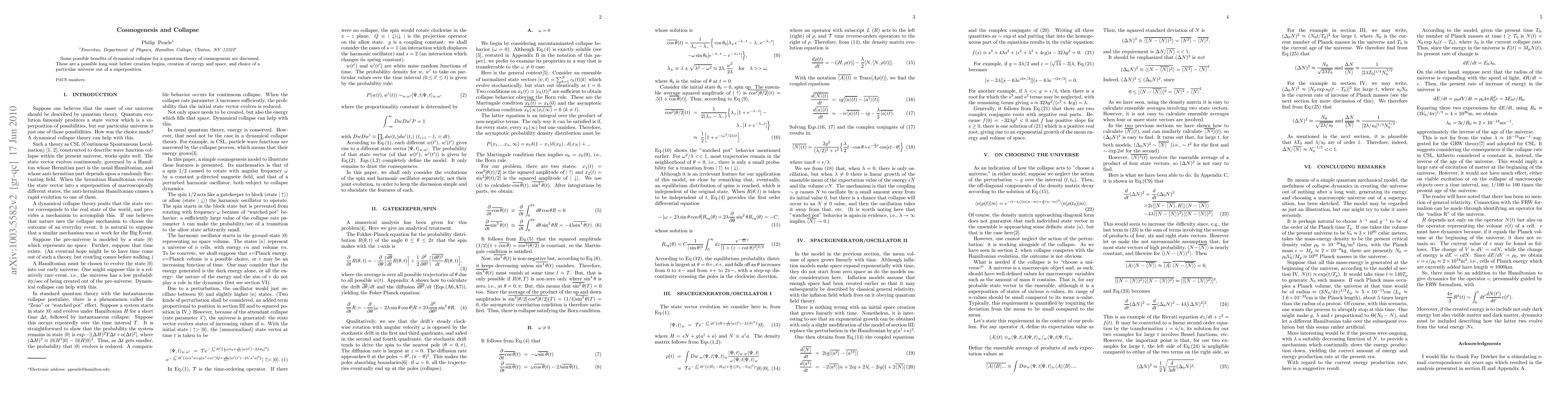 Some possible benefits of dynamical collapse for a quantum theory of cosmogenesis are discussed. These are a possible long wait before creation begins, creation of energy and space, and choice of a particular universe out of a superposition.