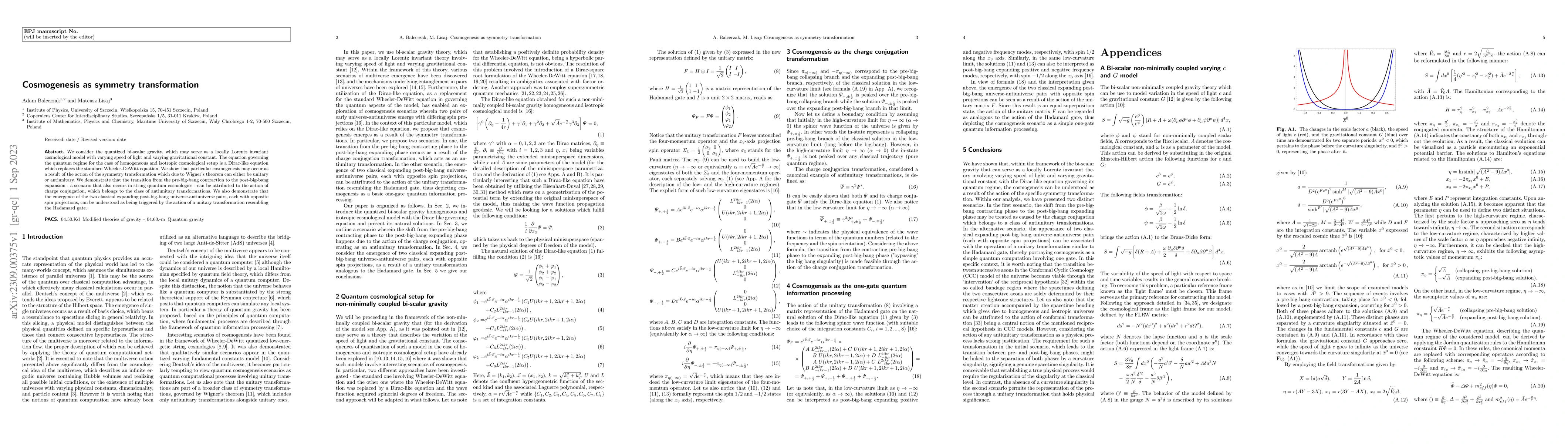 We consider the quantized bi-scalar gravity, which may serve as a locally Lorentz invariant cosmological model with varying speed of light and varying gravitational constant. The equation governing the quantum regime for the case of homogeneous and isotropic cosmological setup is a Dirac-like equation which replaces the standard Wheeler-DeWitt equation. We show that particular cosmogenesis may occur as a result of the action of the symmetry transformation which due to Wigner's theorem can either be unitary or antiunitary. We demonstrate that the transition from the pre-big-bang contraction to the post-big-bang expansion - a scenario that also occurs in string quantum cosmologies - can be attributed to the action of charge conjugation, which belongs to the class of antiunitary transformations. We also demonstrate that the emergence of the two classical expanding post-big-bang universe-antiuniverse pairs, each with opposite spin projections, can be understood as being triggered by the action of a unitary transformation resembling the Hadamard gate.